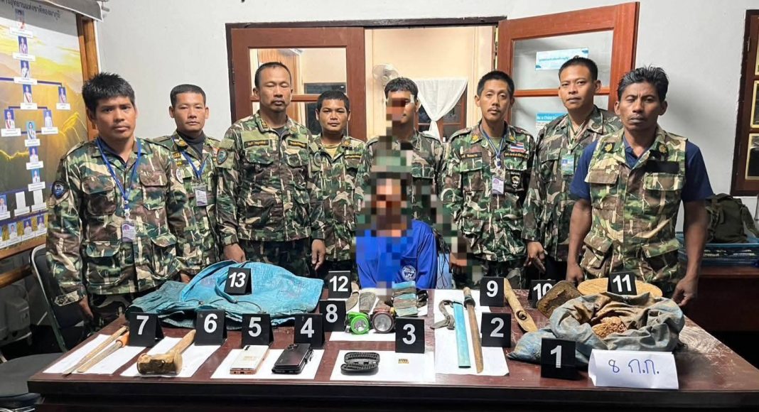 อุทยานแห่งชาติทองผาภูมิ ร่วมกับกองทหารลาดหญ้าและทีมปฏิบัติการพิเศษ ลุยป่าทึบ 16 กิโลเมตร ดักซุ่มจับกุมกลุ่มคนต่างด้าวลักลอบบุกรุกพื้นที่ต้นน้ำลุ่มน้ำชั้น 1A ขุดดินหาแร่ทองคำกลางดึก สร้างความเสียหายกว่า 750,000 บาท