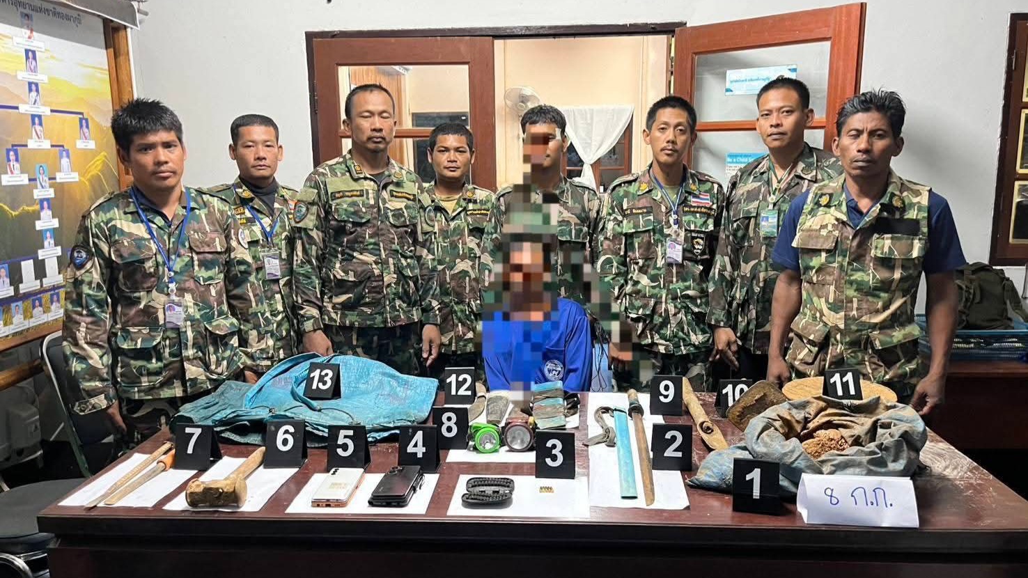 ผลการจับกุมพบ นายโซเอะเกดุ (ไม่มีนามสกุล) อายุ 34 ปี สัญชาติพม่า จากหมู่บ้านยาพู ประเทศเมียนมา แอบหลบอยู่ในหลุมขุดดิน พร้อมยึดของกลาง 13 รายการ ได้แก่ กระสอบดิน 8 กิโลกรัม, มีดดาบ, กระสุนปืน .22 LR จำนวน 5 นัด, โทรศัพท์มือถือ 2 เครื่อง, อุปกรณ์ขุดดินและร่อนแร่ รวมมูลค่าความเสียหาย 756,307 บาท ทั้งนี้ ผู้ต้องหาให้การว่าเดินทางเข้าเมืองไทยผ่านช่องทางธรรมชาติช่องป่าหมาก-ยาพู พร้อมเพื่อนอีก 3 คน โดยถูกชักชวนให้มาขุดดินหาแร่ทองคำ