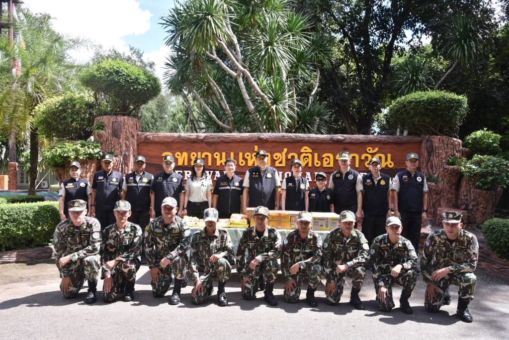 จากนั้น รองนายกรัฐมนตรีและคณะได้มอบเครื่องอุปโภคบริโภคแก่เจ้าหน้าที่อุทยานแห่งชาติเอราวัณ เพื่อเป็นขวัญและกำลังใจในการปฏิบัติงาน.