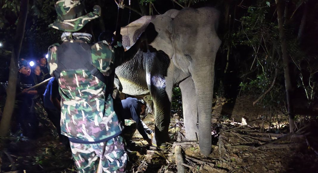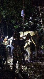 ขณะที่วันที่ 24 พฤศจิกายน 2568 เจ้าหน้าที่อุทยานแห่งชาติกุยบุรี นำโดย นายบำรุงรัตน์ พลอยดำ หัวหน้าอุทยานแห่งชาติกุยบุรี พร้อมด้วยนายอนุรักษ์ สกุลพงษ์ นายสัตวแพทย์ เจ้าหน้าที่สถานีเพาะเลี้ยงสัตว์ป่าห้วยทราย เจ้าหน้าที่ส่วนอนุรักษ์สัตว์ป่า จากสำนักบริหารพื้นที่อนุรักษ์ที่ 3 สาขาเพชรบุรี ได้เข้าพื้นที่เพื่อตรวจสอบติดตามช้างตัวดังกล่าว โดยใช้อากาศยานไร้คนขับ (โดรน) และเดินสำรวจ พบฝูงช้างจำนวน 1 โขลง ซึ่งคาดว่าเป็นโขลงที่มีช้างได้รับบาดเจ็บ แต่ไม่พบช้างตัวตัวดังกล่าว จนเมื่อเวลา 18.40 น. ได้ทำการบินโดรนบริเวณข้างเคียง เพื่อค้นหาช้างตัวที่ได้รับบาดเจ็บอีกครั้ง จนพบช้างตัวที่ได้รับบาดเจ็บบริเวณพื้นที่ จึงได้ประสานงานกับทีมสัตวแพทย์ฯ วางแผนทำการรักษา เมื่อเวลา 19.33 น. ทีมสัตว์แพทย์ฯ ทำการยิงยาซึม และรอจนยาออกฤทธิ์ จึงเข้าทำการตรวจสอบ เบื้องต้น พบบาดแผลขนาด 0.5 ซม. ที่ขาหลังด้านซ้ายมีอาการบวม แผลลึกไม่น้อยกว่า 10 ซม. จึงได้ทำการรักษาและเฝ้าดูอาการ จนเมื่อเวลา 21.19 น. ช้างเริ่มขยับตัวและเดินได้ เจ้าหน้าที่อุทยานแห่งชาติกุยบุรีและทีมสัตว์แพทย์จึงได้ออกจากพื้นที่ และมอบหมายเจ้าหน้าที่หน่วยฯ ป่ายางเฝ้าติดตามอาการช้างต่อไป.