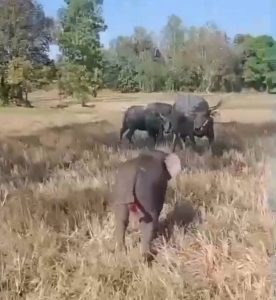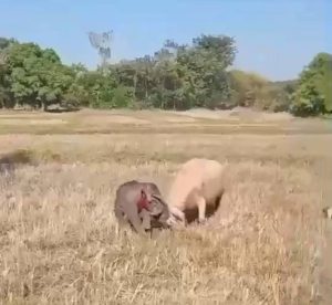 จากจำนวนช้างที่มากทำให้ฝูงแตกกระจาย มีลูกช้างตัวหนึ่งพลัดหลงจากฝูงและวิ่งหลงเข้าไปในทุ่งนาที่มีควายเผือกตัวใหญ่ของชาวบ้านเลี้ยงไว้ เกิดเหตุปะทะกัน ควายเผือกวิ่งเข้าขวิดลูกช้างอย่างแรง ส่งผลให้ลูกช้างได้รับบาดเจ็บเล็กน้อยบริเวณลำคอและก้น แต่ยังเคลื่อนไหวได้ตามปกติ