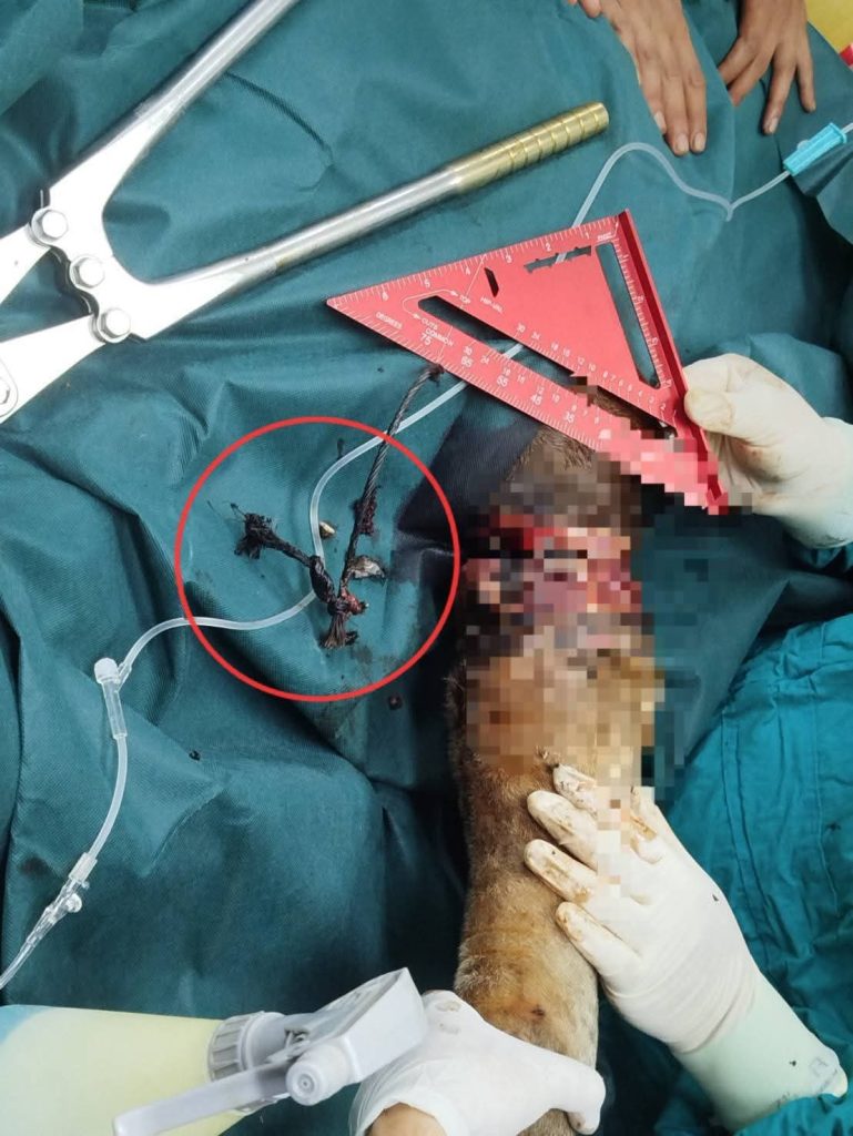 จากการตรวจสอบเบื้องต้นพบว่า บ่วงสลิงพันรัดแน่นที่ขาหน้าขวา จนขาบวมอักเสบอย่างรุนแรง บ่วงได้กัดกินเนื้อเยื่อจนถึงกระดูก จนเกิดภาวะเนื้อตาย (Necrosis) และพบหนอนแมลงวันจำนวนมาก ขณะที่ขาหลังขวาก็พบว่ามีบ่วงสลิงพันแน่นเช่นกัน ทำให้ขาบวมเล็กน้อย และบริเวณข้อเท้าถึงกีบเกิดภาวะเนื้อตาย