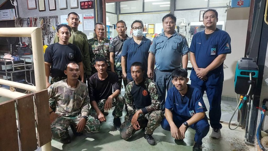 ทีมสัตวแพทย์ได้ปฐมพยาบาลเบื้องต้นด้วยการฉีดยา ณ จุดเกิดเหตุ ก่อนจะรีบนำตัวส่งคลินิกสัตว์ป่า โรงพยาบาลสัตว์ปากช่อง อำเภอปากช่อง จังหวัดนครราชสีมา เพื่อทำการรักษาอย่างเร่งด่วนที่คลินิกฯ ทีมสัตวแพทย์ได้เร่งดำเนินการตัดบ่วงสลิงออก ทำความสะอาดบาดแผลอย่างละเอียด ฉีดยาปฏิชีวนะ และทำแผลอย่างเหมาะสม ขณะนี้ลูกกระทิงตัวดังกล่าวยังอยู่ในความดูแลอย่างใกล้ชิดของทีมสัตวแพทย์ที่คลินิกสัตว์ป่า โรงพยาบาลสัตว์ปากช่อง