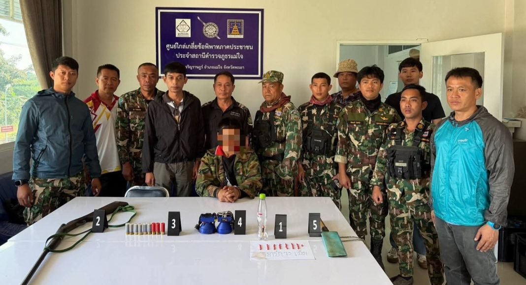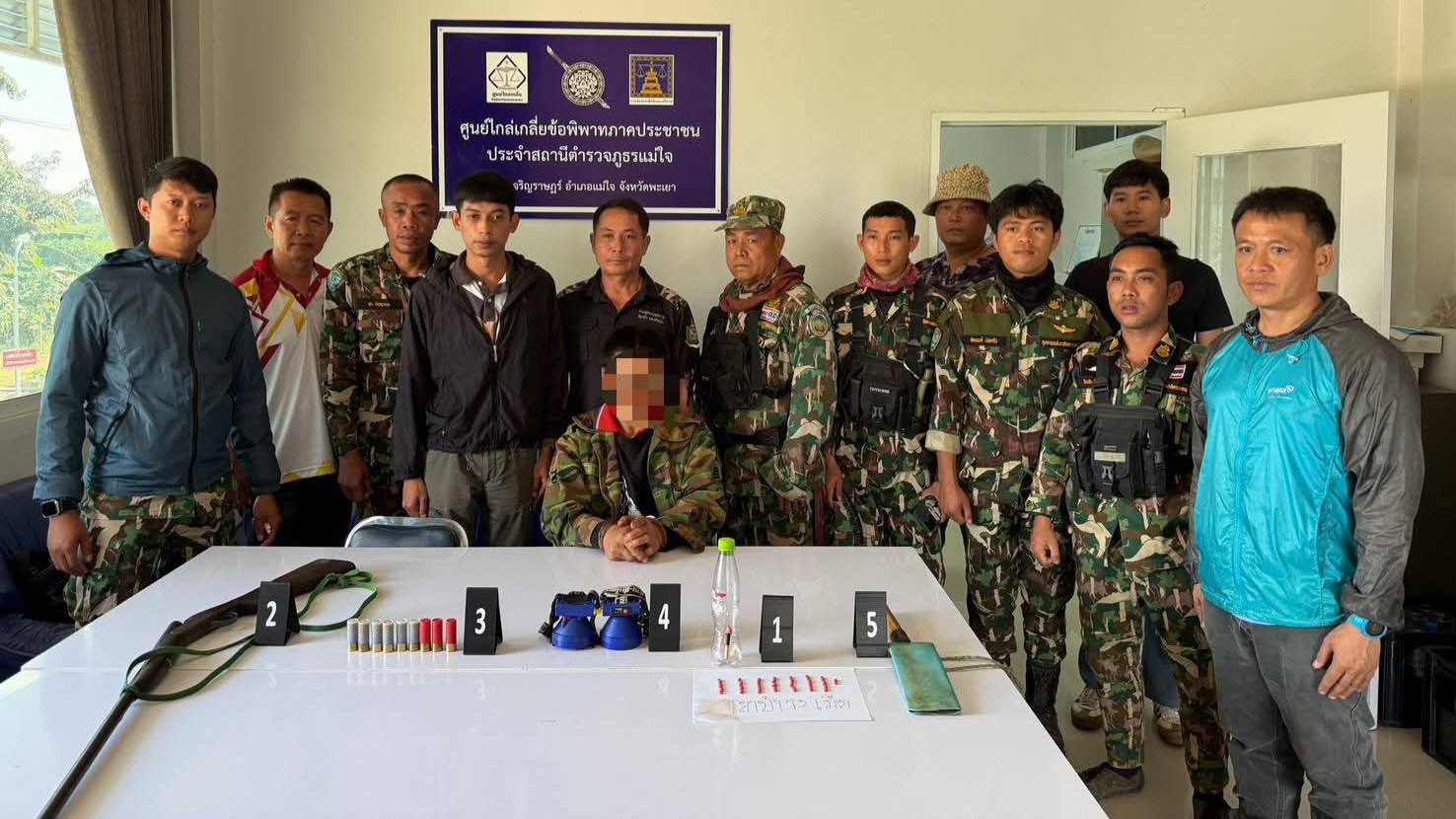 จากการลาดตระเวน เจ้าหน้าที่สามารถจับกุมนายสมศักดิ์ อายุ 38 ปี อาศัยอยู่ตำบลศรีถ้อย อำเภอแม่ใจ จังหวัดพะเยา พร้อมยึดของกลางหลายรายการ ประกอบด้วยปืนลูกซองยาว (ไม่มีหมายเลขทะเบียน) 1 กระบอก กระสุนปืนลูกซอง 9 นัด ยาเสพติดให้โทษประเภท 1 (ยาบ้า) 73 เม็ด ไฟฉายคาดศีรษะ 2 ดวง มีดพร้อมฝัก 1 เล่ม เจ้าหน้าที่ได้นำตัวผู้ต้องหาพร้อมของกลางไปดำเนินคดีที่สถานีตำรวจภูธรอำเภอแม่ใจ จังหวัดพะเยา