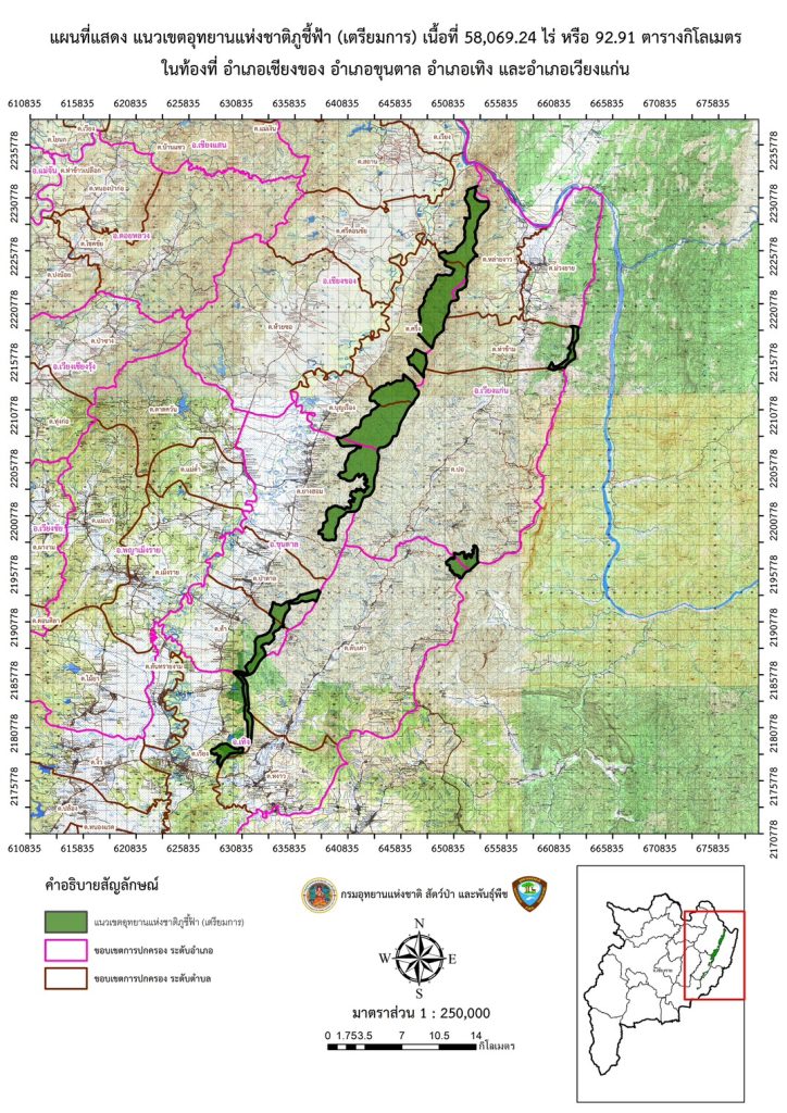สำหรับพื้นที่ดังกล่าวอยู่ในเขตพื้นที่ป่าอนุรักษ์ หรือพื้นที่ป่าโซน C ตามแผนที่ ZONING เนื้อที่ที่สำรวจและเห็นควรจัดตั้งเป็นวนอุทยาน เนื้อที่ประมาณ 2,500 ไร่ ซึ่งปัจจุบันได้อยู่ภายใต้การดูแลของกรมอุทยานแห่งชาติ สัตว์ป่า และพันธุ์พืช ด้วยนโยบายกระทรวงทรัพยากรธรรมชาติและสิ่งแวดล้อมที่จะกำหนดพื้นที่ที่มีสภาพป่าอุดมสมบูรณ์และมีทรัพยากรธรรมชาติที่สำคัญและมีค่า ตลอดจนมีทิวทัศน์ที่สวยงามเป็นที่น่าสนใจให้เป็นพื้นที่ป่าอนุรักษ์ตามกฎหมาย ได้แก่ อุทยานแห่งชาติ เขตรักษาพันธุ์สัตว์ป่า เขตห้ามล่าสัตว์ป่า และพื้นที่คุ้มครองอื่นๆ ให้ได้ในอัตรา ร้อยละ 25 ของพื้นที่ประเทศ ตามนโยบายป่าไม้แห่งชาติ จึงมีคำสั่งให้ดำเนินการสำรวจพื้นที่เตรียมการประกาศเขตอุทยานแห่งชาติ เพื่อให้พื้นที่ในบริเวณอำเภอเทิง อำเภอขุนตาล อำเภอเชียงของ และอำเภอเวียงแก่น จังหวัดเชียงราย ซึ่งมีความอุดมสมบูรณ์จากการดูแลรักษาผืนป่าโดยราษฎรในพื้นที่ ให้คงอยู่อย่างยั่งยืน ตามคำสั่งกรมอุทยานแห่งชาติ สัตว์ป่า และพันธุ์พืช ที่ 1385/2560 ลงวันที่ 12 มิถุนายน พ.ศ.2560 เพื่อประกาศจัดตั้งเป็นอุทยานแห่งชาติภูชี้ฟ้า โดยอาศัยอำนาจตามมาตรา 6 แห่งพระราชบัญญัติอุทยานแห่งชาติ พ.ศ.2562 ซึ่งกำหนดให้กรมอุทยานแห่งชาติ สัตว์ป่า และพันธุ์พืช เสนอคณะรัฐมนตรีพิจารณาให้ความเห็นชอบ โดยตราเป็นพระราชกฤษฎีกาและให้มีแผนที่แสดงแนวเขต ซึ่งจัดทำด้วยระบบภูมิสารสนเทศหรือระบบอื่น ซึ่งมีลักษณะใกล้เคียงกันแนบท้ายพระราชกฤษฎีกานั้น ด้วยเมื่อพระราชกฤษฎีกากำหนดพื้นที่เป็นอุทยานแห่งชาติมีผลใช้บังคับแล้ว ให้มาตรการบังคับหรือมาตรการคุ้มครองในพื้นที่ดังกล่าวเป็นไปตามที่กำหนดในพระราชบัญญัติอุทยานแห่งชาติ พ.ศ.2562 เว้นแต่กฎหมายอื่นจะได้กำหนดมาตรการในเรื่องดังกล่าวไว้ไม่ต่ำกว่ามาตรการที่กำหนดในพระราชบัญญัติอุทยานแห่งชาติ พ.ศ.2562