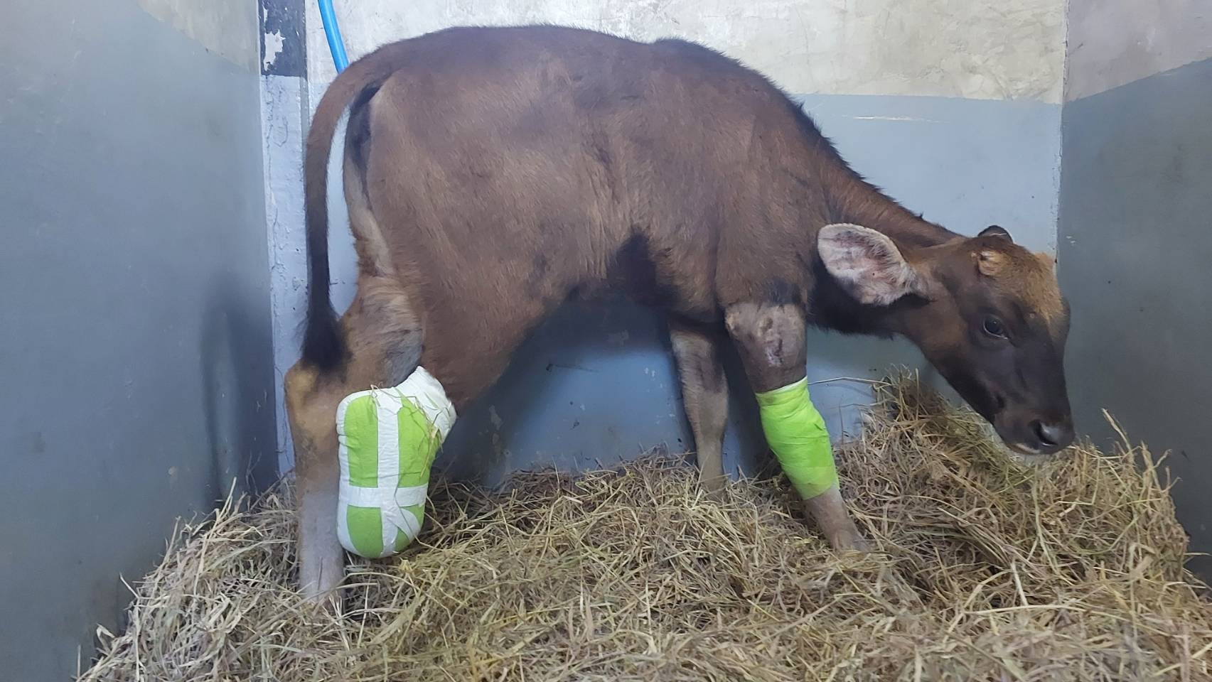 หลังการผ่าตัด ลูกกระทิงฟื้นตัวดี สามารถยืน 3 ขาได้ ทีมสัตวแพทย์ได้ให้ยาปฏิชีวนะ ยาลดปวดลดอักเสบ และจะทำการติดตามประเมินอาการอย่างใกล้ชิดต่อไป.