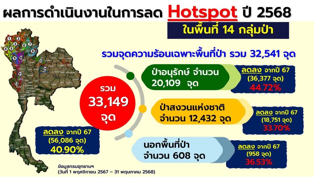 - กางตาข่ายเฝ้าระวัง 3,895 จุดทั่วประเทศ กระจายใน 17 จังหวัดภาคเหนือ 2,744 จุด และพื้นที่ 14 กลุ่มป่า 2,082 จุด โดยเชียงใหม่มีมากสุด 473 จุด ตามด้วยแม่ฮ่องสอน 339 จุด และกาญจนบุรี 207 จุด
