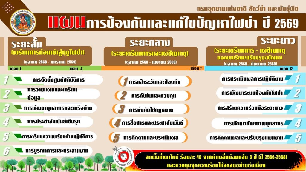 อธิบดีกรมอุทยานฯ เน้นย้ำว่า ในฐานะผู้อำนวยการศูนย์ปฏิบัติการเฝ้าระวังและควบคุมไฟป่า 14 กลุ่มป่า ได้วางโครงสร้างการทำงานร่วมกับอธิบดีกรมป่าไม้และอธิบดีกรมควบคุมมลพิษ เพื่อคุมเข้มพื้นที่ภาคเหนือ ภาคตะวันออกเฉียงเหนือ และภาคตะวันตก โดยตั้งเป้าปิด “จุดเกรงใจ” ซึ่งเป็นรอยต่อป่าที่มักเกิดปัญหาทับซ้อน ด้วยการบูรณาการการทำงาน 3 ฝ่ายระหว่างกรมอุทยานฯ กรมป่าไม้ และองค์กรปกครองส่วนท้องถิ่น พร้อมสนับสนุนงบประมาณจ้างเจ้าหน้าที่ดับไฟป่าในหมู่บ้านเป้าหมายและใช้งบกลางสนับสนุนในส่วนที่จำเป็น เพื่อเพิ่มพละกำลังในการลาดตระเวนและดับไฟป่าให้ทั่วถึง