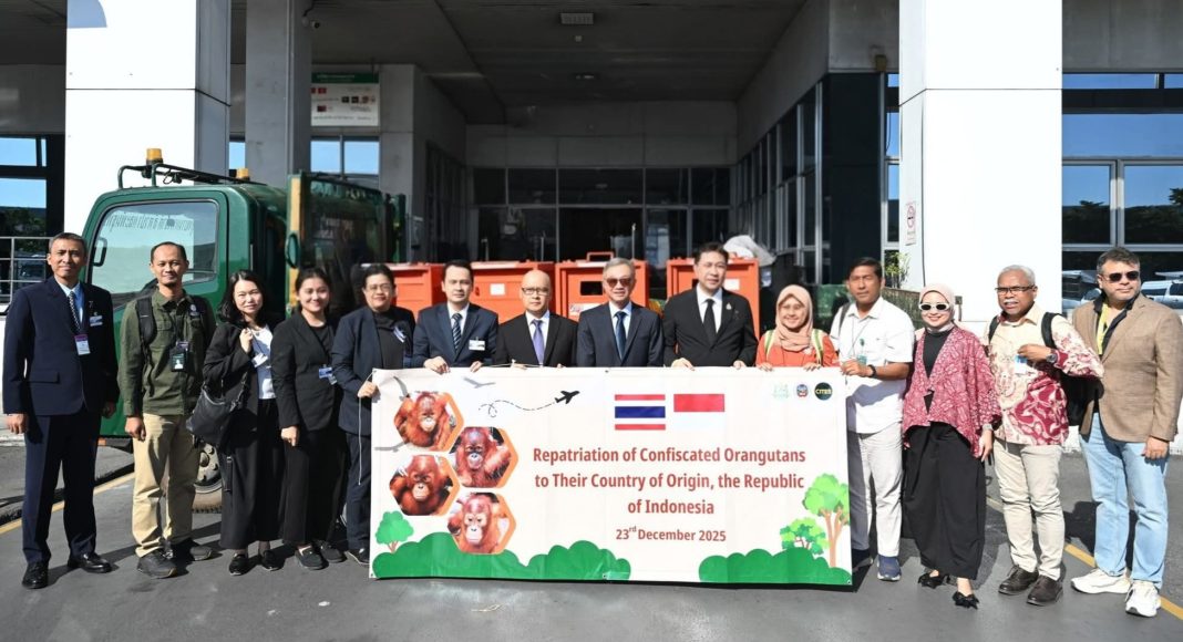 วันที่ 23 ธันวาคม 2568 เวลา 10.00 น. นายอรรถพล เจริญชันษา อธิบดีกรมอุทยานแห่งชาติ สัตว์ป่า และพันธุ์พืช มอบหมายให้นายสดุดี พันธุ์ภักดี ผู้อำนวยการกองคุ้มครองพันธุ์สัตว์ป่าและพืชป่าตามอนุสัญญา (CITES) กรมอุทยานแห่งชาติ สัตว์ป่า และพันธุ์พืช เป็นผู้แทนกรมอุทยานแห่งชาติฯ พร้อมด้วยคณะเจ้าหน้าที่จากสำนักอนุรักษ์สัตว์ป่า เข้าร่วมพิธีส่งอุรังอุตัง จำนวน 4 ตัว ประกอบด้วย อุรังอุตังสุมาตรา จำนวน 3 ตัว และอุรังอุตังทาปานูลี จำนวน 1 ตัว โดยเป็นเพศผู้ 2 ตัว เพศเมีย 2 ตัว กลับคืนสู่ถิ่นกำเนิด ณ สาธารณรัฐอินโดนีเซีย