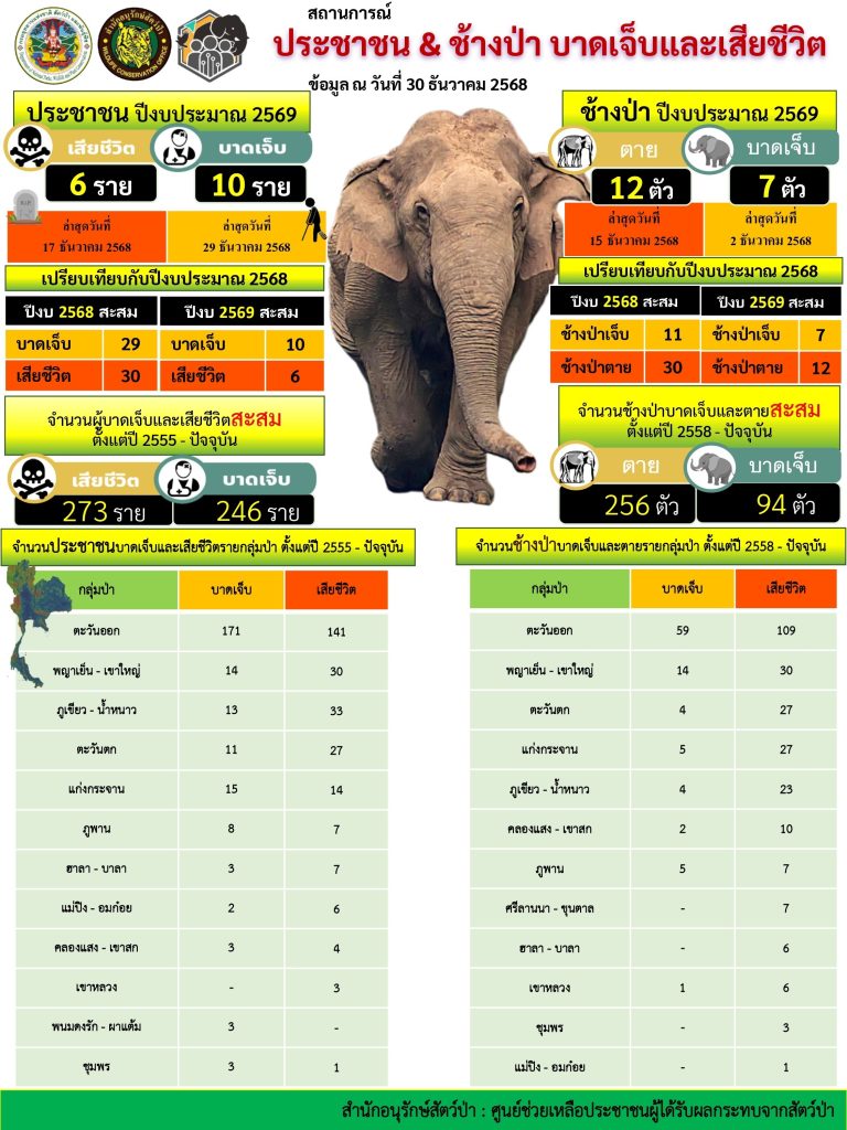 (30 ธ.ค. 2568) นายพรชัย คำนึง หัวหน้าเขตรักษาพันธุ์สัตว์ป่าคลองเครือหวายเฉลิมพระเกียรติ จ.จันทบุรี รายงานว่า เมื่อวันที่ 28 ธ.ค. 2568 เกิดเหตุช้างป่าทำร้ายราษฎรเครือข่ายเฝ้าระวังช้างป่าบาดเจ็บ 1 ราย ขณะปฏิบัติหน้าที่ร่วมกับเจ้าหน้าที่ผลักดันช้างป่า บริเวณสวนผลไม้ของชาวบ้าน ท้องที่บ้านพญากำพุช ม.2 ต.โป่งน้ำร้อน อ.โป่งน้ำร้อน จ.จันทบุรี โดยเป็นการปฏิบัติหน้าที่ของชุดเคลื่อนที่เร็วฯ ชุดที่ 21 เข้าพื้นที่เฝ้าระวังและผลักดันช้างป่า ท้องที่บ้านพญากำพุช ม.2 ต.โป่งน้ำร้อน อ.โป่งน้ำร้อน จ.จันทบุรี พบช้างป่าจำนวนมากกว่า 20 ตัว จึงผลักดันกลับเขตป่ากองทัพเรือ