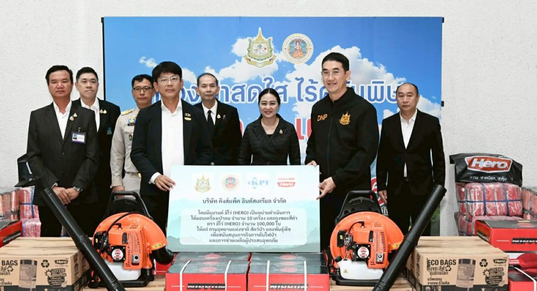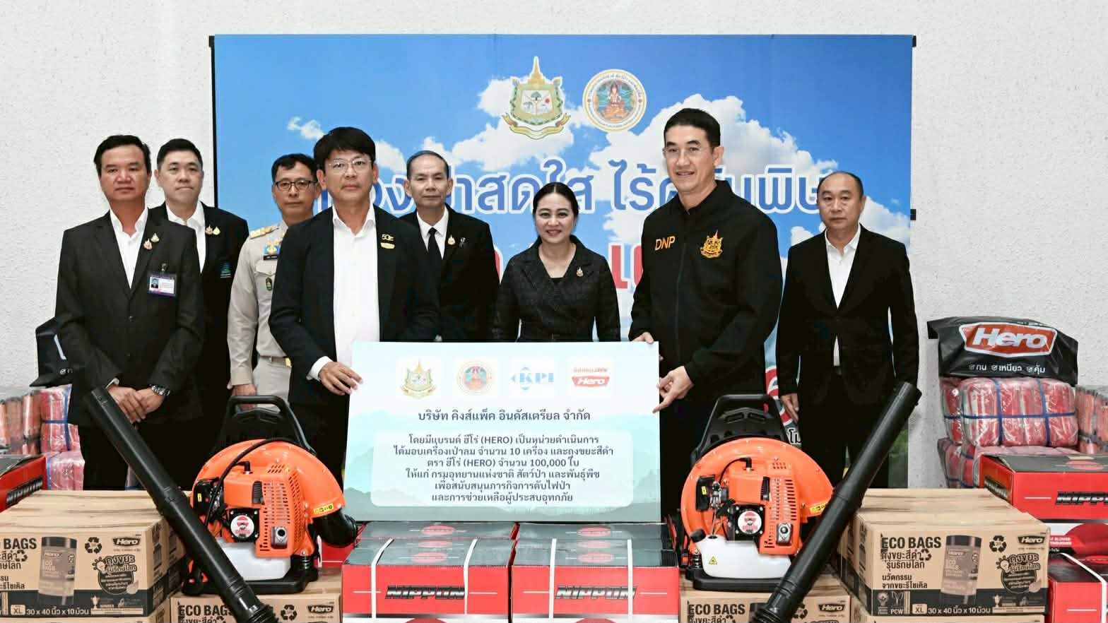 ในการนี้ ดร.รวีวรรณ ภูริเดช ปลัดกระทรวงทรัพยากรธรรมชาติและสิ่งแวดล้อม ให้เกียรติเป็นประธานและสักขีพยานในพิธีมอบอุปกรณ์สนับสนุนภารกิจป้องกันไฟป่า ประกอบด้วย เครื่องเป่าลมจำนวน 10 เครื่อง และถุงขยะรีไซเคิลตรา “ฮีโร่” (HERO) จำนวน 100,000 ใบ ซึ่งเป็นผลิตภัณฑ์นวัตกรรมจากบริษัท คิงส์แพ็ค อินดัสเตรียล จำกัด โดยมี นายอรรถพล เจริญชันษา อธิบดีกรมอุทยานแห่งชาติ สัตว์ป่า และพันธุ์พืช เป็นผู้รับมอบจาก ดร.ทวี จุลศักดิ์ศรีสกุล ประธานกรรมการบริหารบริษัท คิงส์แพ็ค อินดัสเตรียล จำกัด ณ หน้าห้องแถลงข่าว ชั้น 1 กระทรวงทรัพยากรธรรมชาติและสิ่งแวดล้อม