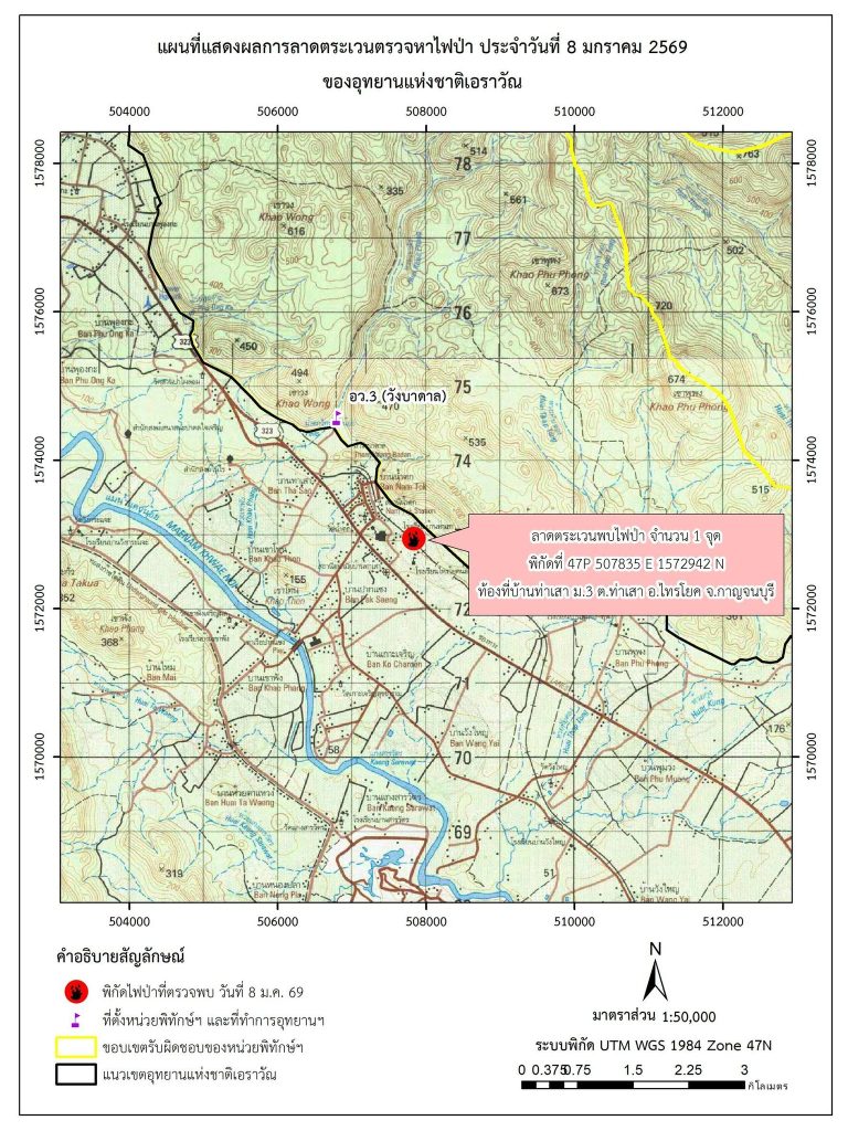 เมื่อเวลา 18.20 น. ของวันที่ 8 มกราคม 2569 ขณะที่เจ้าหน้าที่หน่วยพิทักษ์อุทยานแห่งชาติเอราวัณที่ อว.3 (วังบาดาล) กำลังออกลาดตระเวนตามภารกิจปกติ ได้ตรวจพบกลุ่มควันหนาแน่นบริเวณป่าบ้านหลังสถานีรถไฟ หมู่ที่ 3 ต.ท่าเสา อ.ไทรโยค จ.กาญจนบุรี แม้จุดเกิดเหตุจะอยู่นอกเขตอุทยานฯ แต่เพื่อป้องกันไฟลุกลามเข้าสู่พื้นที่ป่าอนุรักษ์ เจ้าหน้าที่จึงได้สนธิกำลังร่วมกับสถานีควบคุมไฟป่าสลักพระ-เอราวัณ รวม 18 นาย เข้าสกัดเพลิงทันที โดยสามารถควบคุมไฟได้ในเวลา 18.30 น. และดับสนิทในเวลา 19.40 น. พบพื้นที่เสียหายประมาณ 2 ไร่
