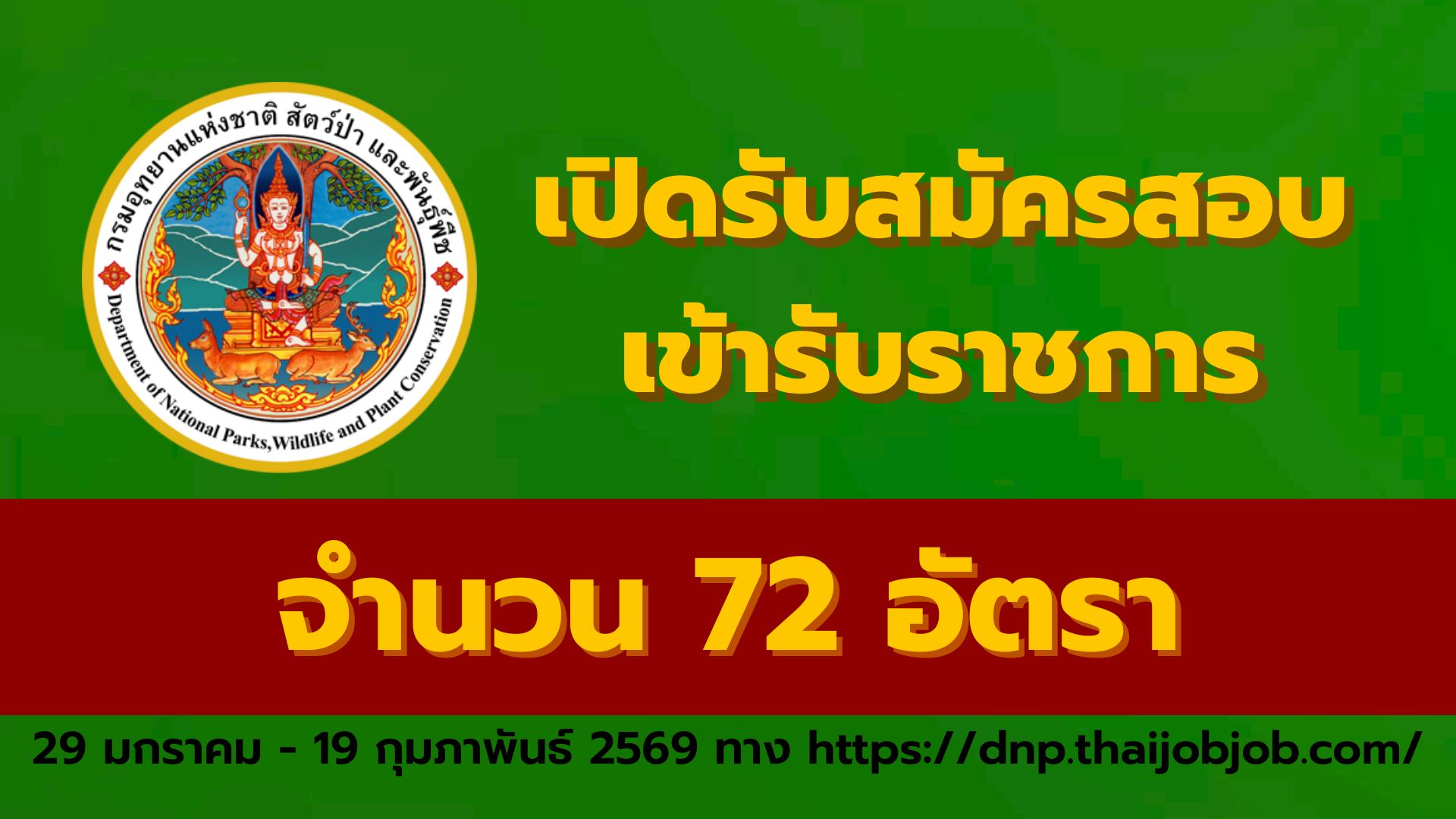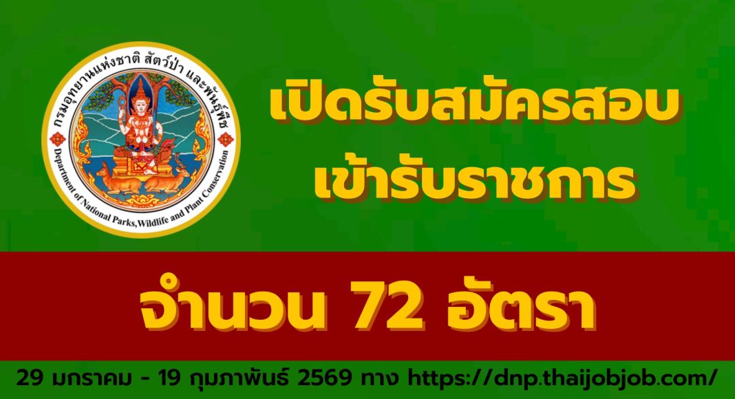 กรมอุทยานแห่งชาติ สัตว์ป่า และพันธุ์พืช ประกาศรับสมัครบุคคลเพื่อบรรจุและแต่งตั้งเข้ารับราชการ ประจำปีงบประมาณ พ.ศ. 2569 ผู้สมัครต้องเลือกตำแหน่งและหน่วยงานที่จะสมัคร สมัครได้ทางอินเทอร์เน็ต ตั้งแต่วันที่ 29 มกราคม 2569 ถึงวันที่ 19 กุมภาพันธ์ 2569 ตลอด 24 ชั่วโมง ไม่เว้นวันหยุดราชการ ทางเว็บไซต์ https://dnp.thaijobjob.com โดยสอบแข่งขันเพื่อบรรจุและแต่งตั้งเข้ารับราชการในตำแหน่งต่างๆ จำนวน 7 สายงาน และสอบคัดเลือกเพื่อบรรจุและแต่งตั้งบุคคลเข้ารับราชการ จำนวน 4 สายงาน รวม 72 อัตรา ดังนี้