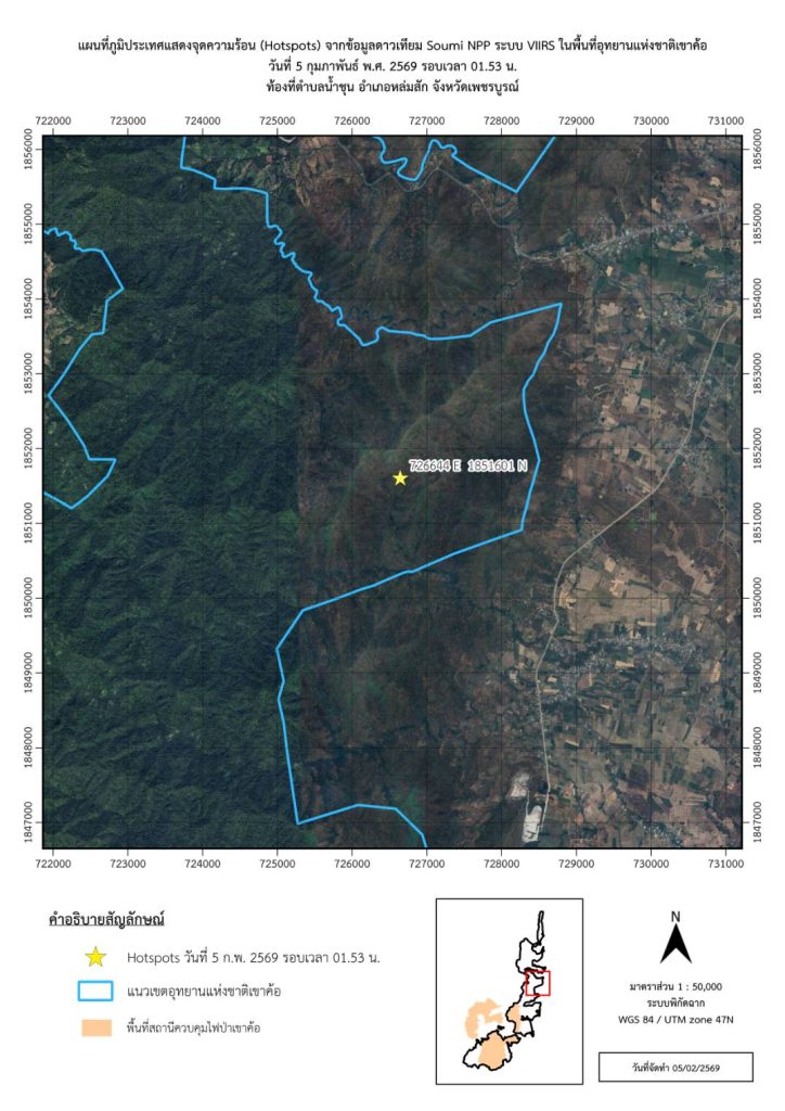วันนี้ (5 กุมภาพันธ์ 2569) นายเสกสรรค์ เที่ยงพลับ หัวหน้าอุทยานแห่งชาติเขาค้อ รายงานผลการปฏิบัติงานภายใต้ศูนย์สั่งการและติดตามสถานการณ์ไฟป่าและหมอกควัน (War Room) สำนักบริหารพื้นที่อนุรักษ์ที่ 11 (พิษณุโลก) เจ้าหน้าที่ตรวจสอบดาวเทียม Suomi NPP (ระบบ VIIRS) ตรวจพบจุดความร้อน (Hotspot) ในพื้นที่รับผิดชอบจากการตรวจสอบ เมื่อเวลา 01.53 น. เกิดไฟป่าในพื้นที่ ตำบลน้ำชุน อำเอหล่มสัก จังหวัดเพชรบูรณ์ ซึ่งเป็นเขตป่าเบญจพรรณ ได้ระดมกำลังเจ้าหน้าที่รวม 10 นาย จากหน่วยงานที่เกี่ยวข้องเข้าพื้นที่ทันที ประกอบด้วย เจ้าหน้าที่ประจำหน่วยพิทักษ์ฯ ที่ ขค.3 (ผาซ่อนแก้ว) เจ้าหน้าที่ประจำจุดเฝ้าระวังไฟป่าน้ำชุนน้อย เจ้าหน้าที่ประจำจุดเฝ้าระวังไฟห้วยโปร่งล่าง เจ้าหน้าที่ประจำจุดเฝ้าระวังไฟ ดงหลง