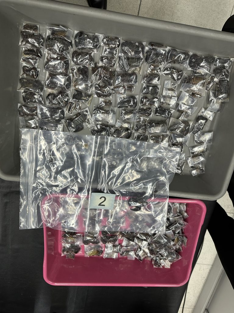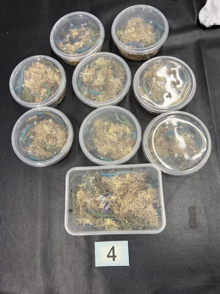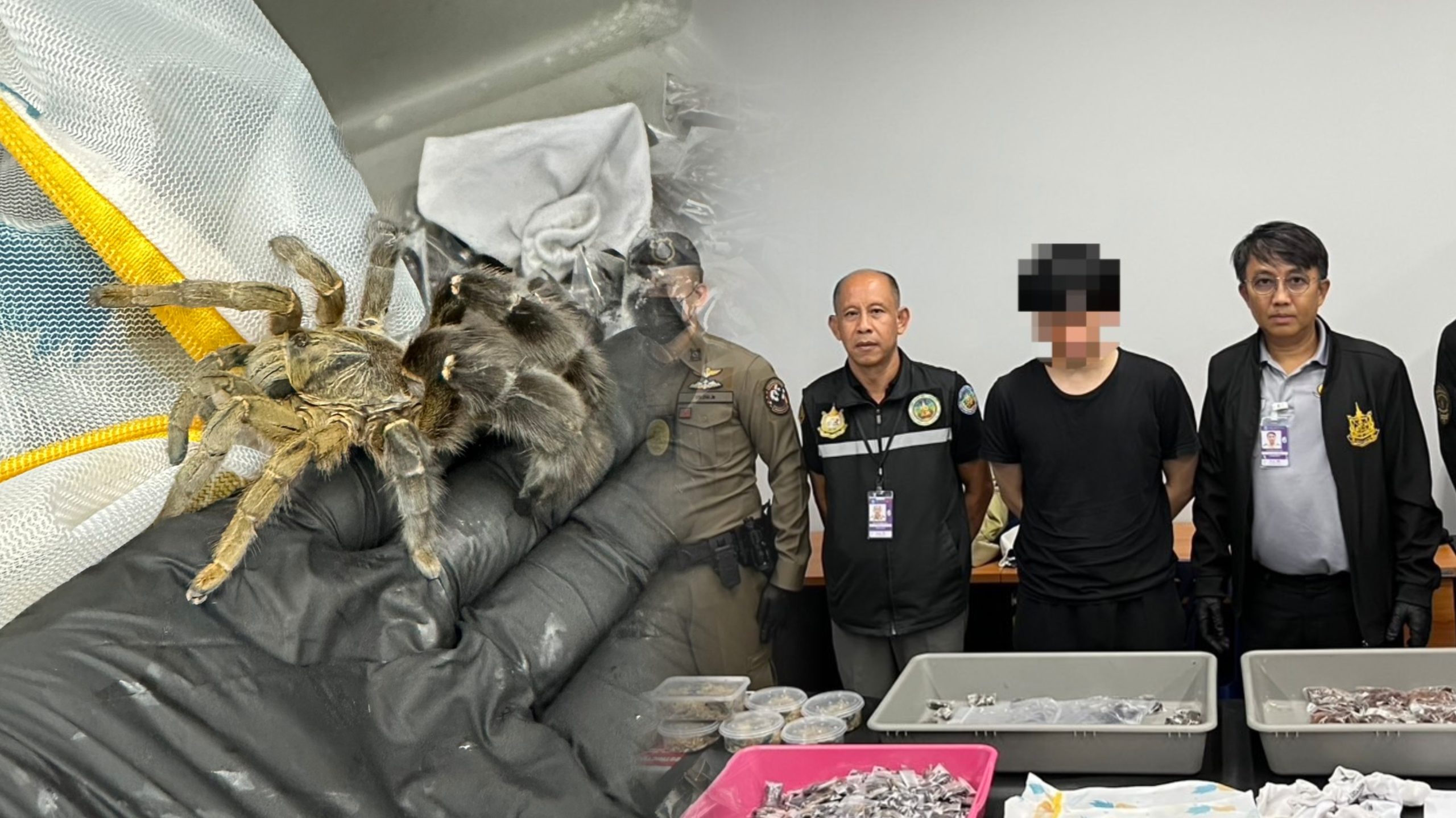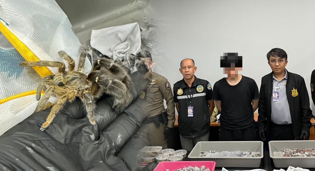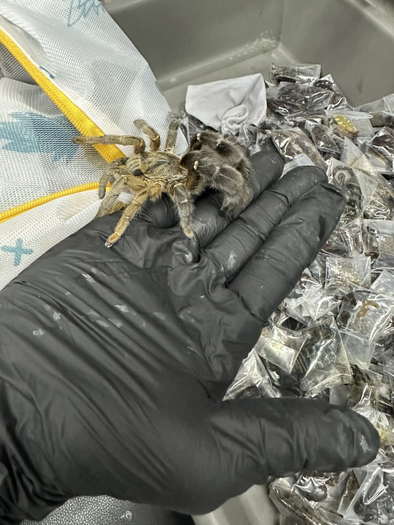 จากการตรวจค้น พบของกลางเป็นสัตว์ป่ามีชีวิต จำนวนรวม 410 ตัว ประกอบด้วย แมงมุมทารันทูล่า 104 ตัว แมงป่อง 138 ตัว จิ้งจกแคระ 160 ตัว ตะขาบ 10 ตัว โดยทั้งหมดใส่ซุกซ่อนกับสัมภาระในกระเป๋าเดินทางทรงแข็งมีล้อเลื่อน 1 ใบ