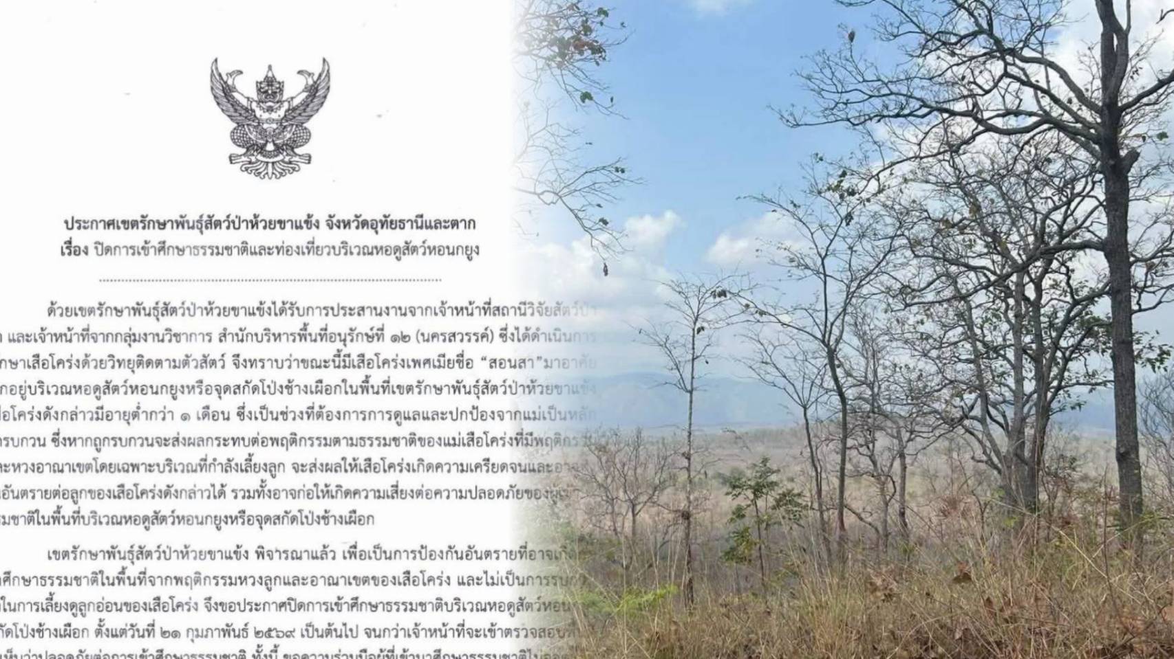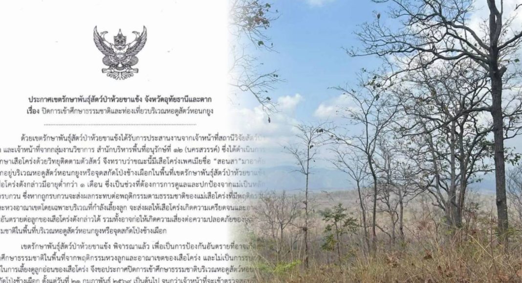 เขตรักษาพันธุ์สัตว์ป่าห้วยขาแข้ง ร่วมกับสถานีวิจัยสัตว์ป่าเขานางรำ เปิดเผยข้อมูลสำคัญด้านการอนุรักษ์ หลังพบพฤติกรรม “สอนสา” เสือโคร่งสาวแรกรุ่นทายาทแม่อภิญญา ได้เลือกพื้นที่บริเวณหอดูสัตว์หอนกยูงเป็นชัยภูมิในการให้กำเนิดลูกน้อยครอกแรก นำไปสู่การประกาศปิดพื้นที่เข้าศึกษาธรรมชาติชั่วคราวเพื่อความปลอดภัยและลดการรบกวนสัญชาตญาณแม่เสือ