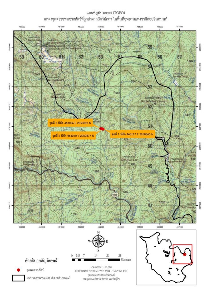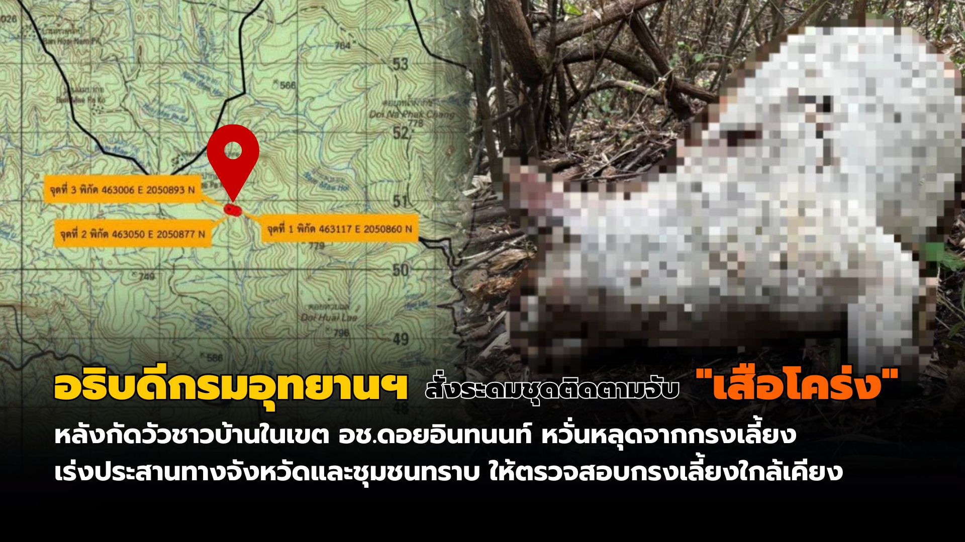 วันที่ 24 กุมภาพันธ์ 2569 นายอรรถพล เจริญชันษา อธิบดีกรมอุทยานแห่งชาติ สัตว์ป่า และพันธุ์พืช เปิดเผยว่า จากรายงานของนายจิรนิติ เชิงสะอาด หัวหน้าอุทยานแห่งชาติดอยอินทนนท์ แจ้งว่า เมื่อเวลา 10.00 น. เจ้าหน้าที่อุทยานแห่งชาติดอยอินทนนท์ จังหวัดเชียงใหม่ ลงพื้นที่ตรวจสอบกรณีได้รับแจ้งจากชาวบ้านว่ามีการพบเห็นสัตว์ป่าคล้ายเสือโคร่งขนาดใหญ่ บริเวณป่าบ้านแม่ป่าก่อ หมู่ที่ 9 ตำบลบ้านหลวง อำเภอจอมทอง จังหวัดเชียงใหม่ จากการตรวจสอบพบร่องรอยอุ้งตีนสัตว์หลายรอยในบริเวณที่ได้รับแจ้ง แต่ยังไม่สามารถระบุชนิดสัตว์ได้อย่างชัดเจน โดยขนาดร่องรอยอุ้งตีนมีความกว้างประมาณ 6-7 เซนติเมตร นอกจากนี้ ยังพบซากวัวถูกกัดบริเวณลำคอ จำนวน 3 ซาก ในพื้นที่ใกล้เคียงกัน 3 จุด ได้แก่ พิกัด 463117 E 2050860 N พิกัด 463050 E 2050877 N และพิกัด 463006 E 2050893N ซึ่งแต่ละจุดอยู่ห่างกันประมาณ 50 เมตร จากนั้นเวลา 13.00 น. เจ้าหน้าที่อุทยานแห่งชาติดอยอินทนนท์ ได้ดำเนินการติดตั้งกล้องดักถ่ายภาพ (Camera Trap) เพื่อเฝ้าติดตามและตรวจสอบการเคลื่อนไหวของสัตว์ป่าในพื้นที่