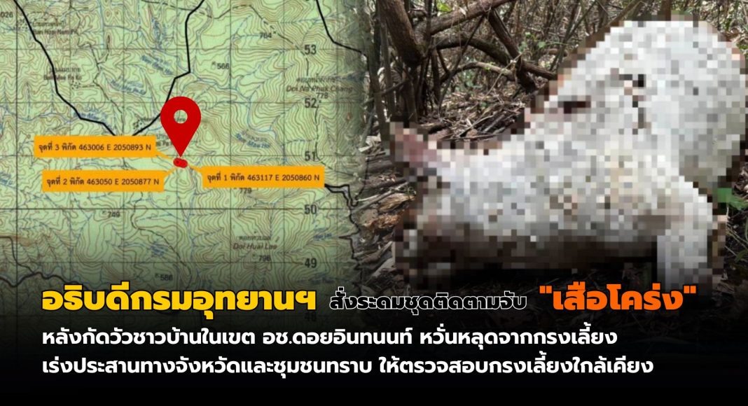 อธิบดีกรมอุทยานฯ สั่งระดมชุดติดตามจับ “เสือโคร่ง” หลังกัดวัวชาวบ้านในเขต อช.ดอยอินทนนท์ จ.เชียงใหม่ หวั่นหลุดจากกรงเลี้ยง เร่งประสานทางจังหวัดและชุมชน อ.จอมทอง ทราบ และให้ตรวจสอบกรงเลี้ยงใกล้เคียง