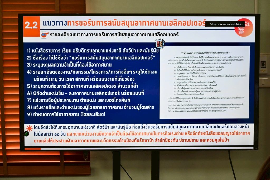 สำหรับการยกระดับปฏิบัติการทางอากาศ กรมอุทยานฯ ได้หารือร่วมกับศูนย์เทคโนโลยีดิจิทัลและอากาศยาน (ศทอ.) เพื่อปรับกลยุทธ์การใช้เฮลิคอปเตอร์สนับสนุนการดับไฟป่า โดยกำหนดภารกิจตามลำดับความสำคัญ 5 ด้าน คือ การช่วยชีวิตเป็นภารกิจเร่งด่วนที่สุดในกรณีเจ้าหน้าที่หรือประชาชนได้รับอันตราย การส่งกำลังพลเพื่อเคลื่อนย้ายเจ้าหน้าที่ชุดดับไฟป่าเข้าสู่พื้นที่เข้าถึงยากเพื่อให้การดับไฟภาคพื้นดินมีประสิทธิภาพสูงสุด การขนส่งเสบียงอาหารเจ้าหน้าที่ชุดดับไฟป่า การทิ้งน้ำสนับสนุนเพื่อหน่วงไฟในพื้นที่ลาดชันสูง และการใช้เทคโนโลยีอื่นควบคู่ในการลาดตระเวน เพื่อความความคุ้มค่าและเหมาะสมกับงบประมาณ พร้อมกันนี้ ยังได้ประสานการปฏิบัติขั้นตอนการขอรับสนับสนุนอากาศยานให้มีความกระชับทันต่อเหตุการณ์ให้มากขึ้น เนื่องจากสถานการณ์ไฟป่าตอนนี้อยู่ในระยะการเผชิญเหตุในการปฏิบัติการการควบคุมและดับไฟป่า โดยในกรณีวิกฤตหรือเร่งด่วนสามารถประสานขอรับการสนับสนุนอากาศยานเพื่อยับยั้งสถานการณ์ได้ทันท่วงที นอกจากนี้ ยังได้ประสานความร่วมมือกับฝ่ายปกครองและกรมฝนหลวงฯ เพื่อเตรียมจัดทำฝนหลวงในพื้นที่ที่เหมาะสม ถือเป็นการบูรณาการทุกสรรพกำลังเพื่อรักษาทรัพยากรป่าไม้ของชาติอย่างยั่งยืน.