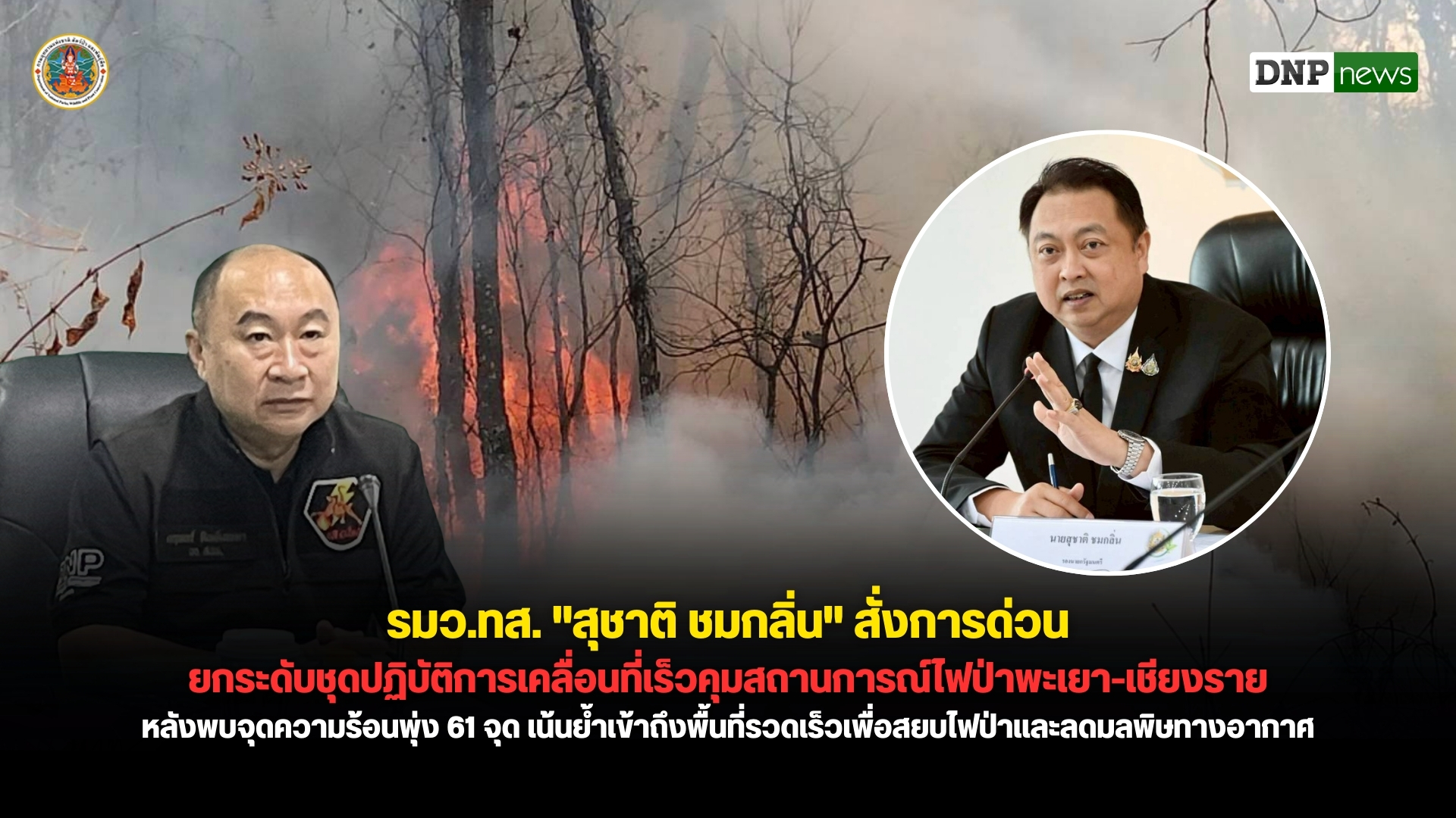 รมว.ทส. “สุชาติ ชมกลิ่น” สั่งการด่วน ยกระดับชุดปฏิบัติการเคลื่อนที่เร็วคุมสถานการณ์ไฟป่าพะเยา-เชียงราย หลังพบจุดความร้อนพุ่ง 61 จุด เน้นย้ำเข้าถึงพื้นที่รวดเร็วเพื่อสยบไฟป่าและลดมลพิษทางอากาศ