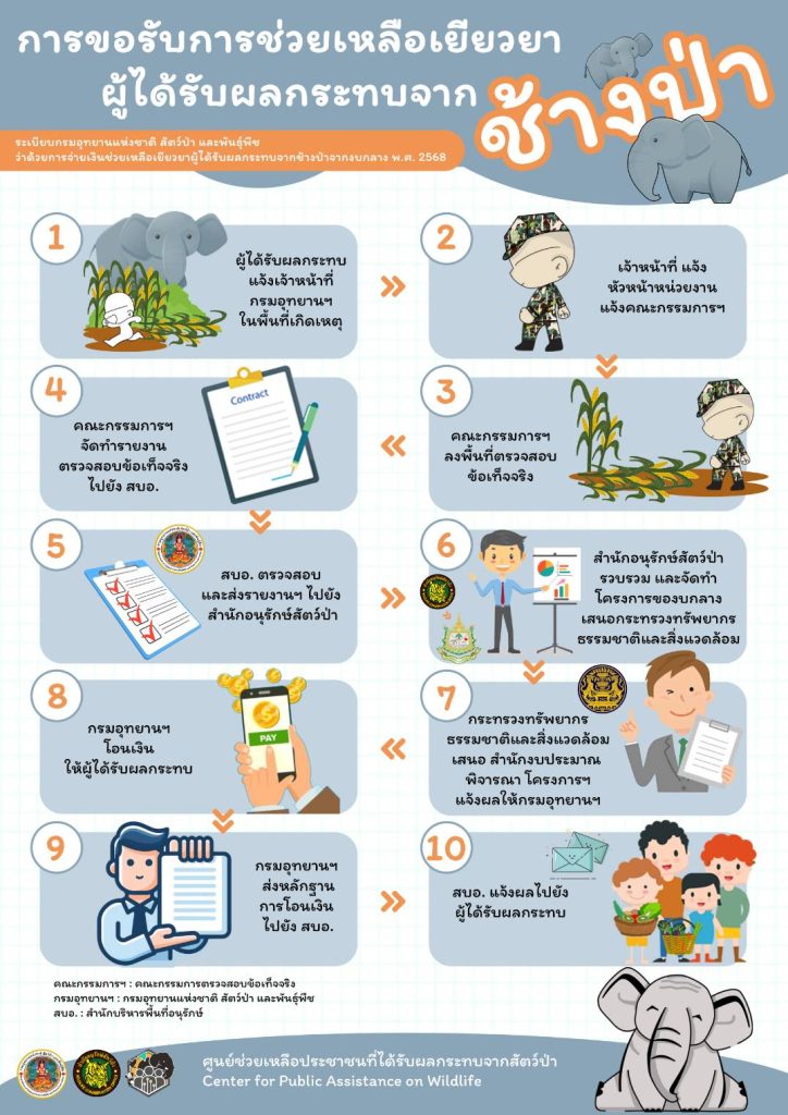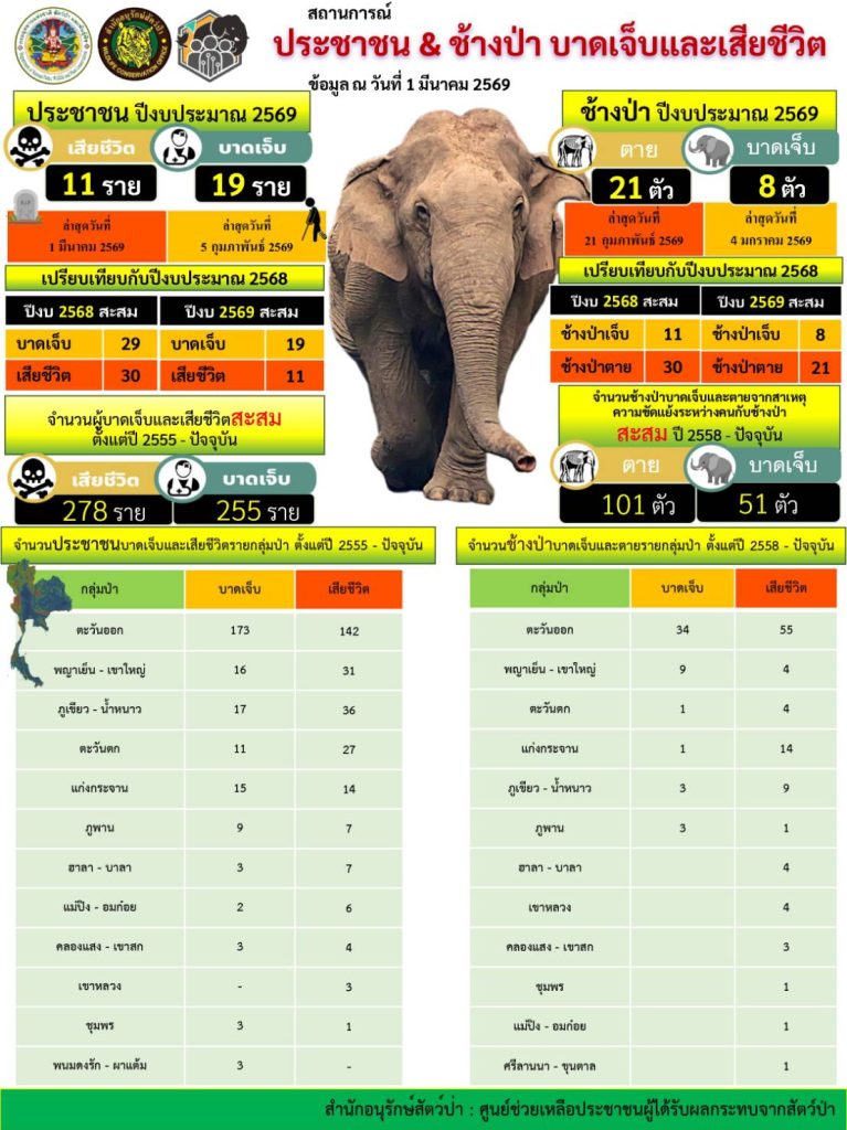 วันที่ 4 มีนาคม 2569 นายสุชาติ ชมกลิ่น รัฐมนตรีว่าการกระทรวงทรัพยากรธรรมชาติและสิ่งแวดล้อม (รมว.ทส.) เปิดเผยว่า รัฐบาลได้สนับสนุนงบกลางให้กับกรมอุทยานแห่งชาติ สัตว์ป่า และพันธุ์พืช ไปเยียวยาราษฎรที่ได้รับผลกระทบจากช้างป่า ซึ่งเป็นตามนโยบายเร่งด่วนที่ให้ความสำคัญกับการบรรเทาความเดือดร้อนของประชาชนเป็นลำดับแรก และให้เร่งโอนเงินเยียวยาให้ประชาชนผู้ได้รับความเดือดร้อนโดยเร็วที่สุด