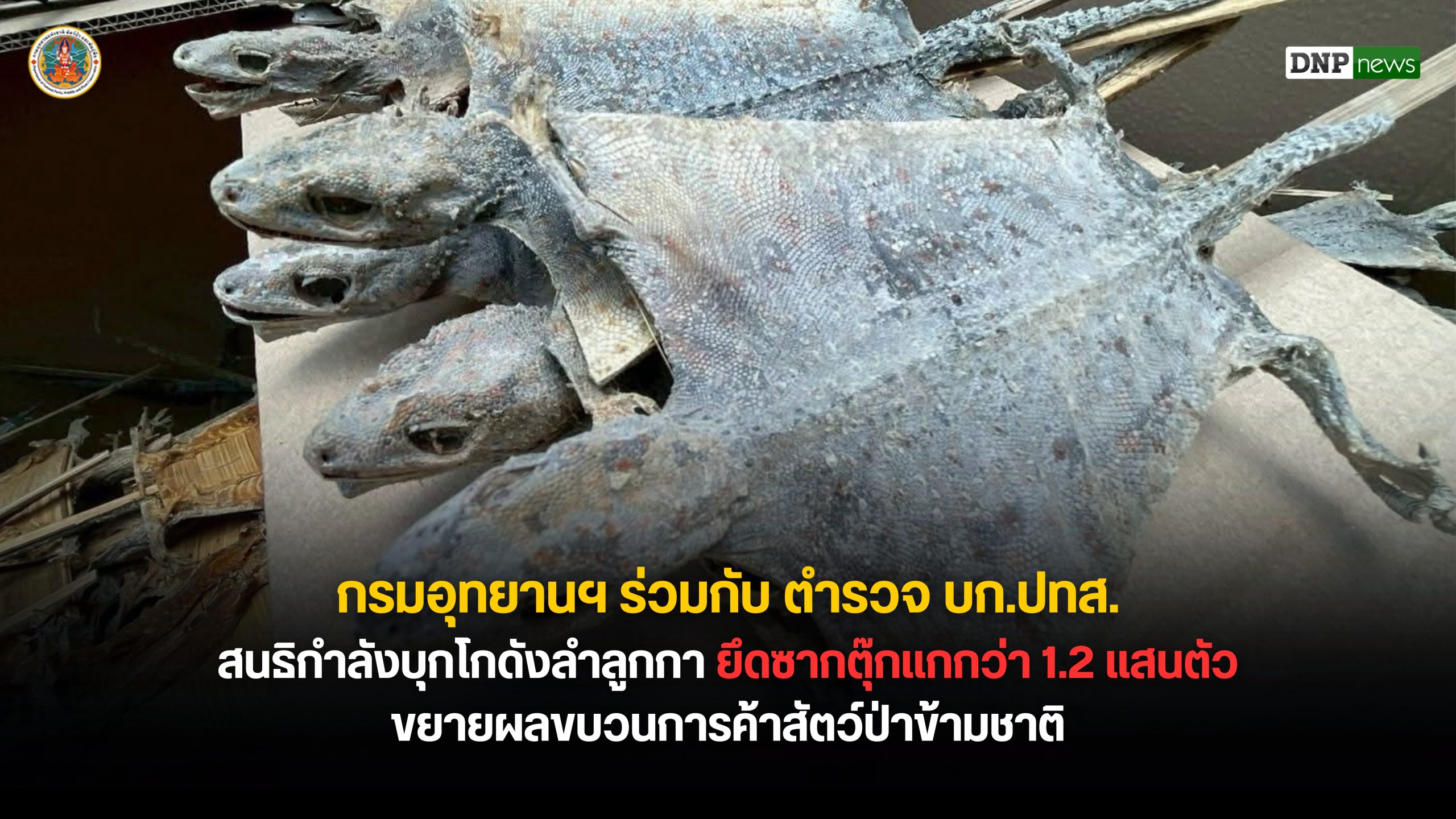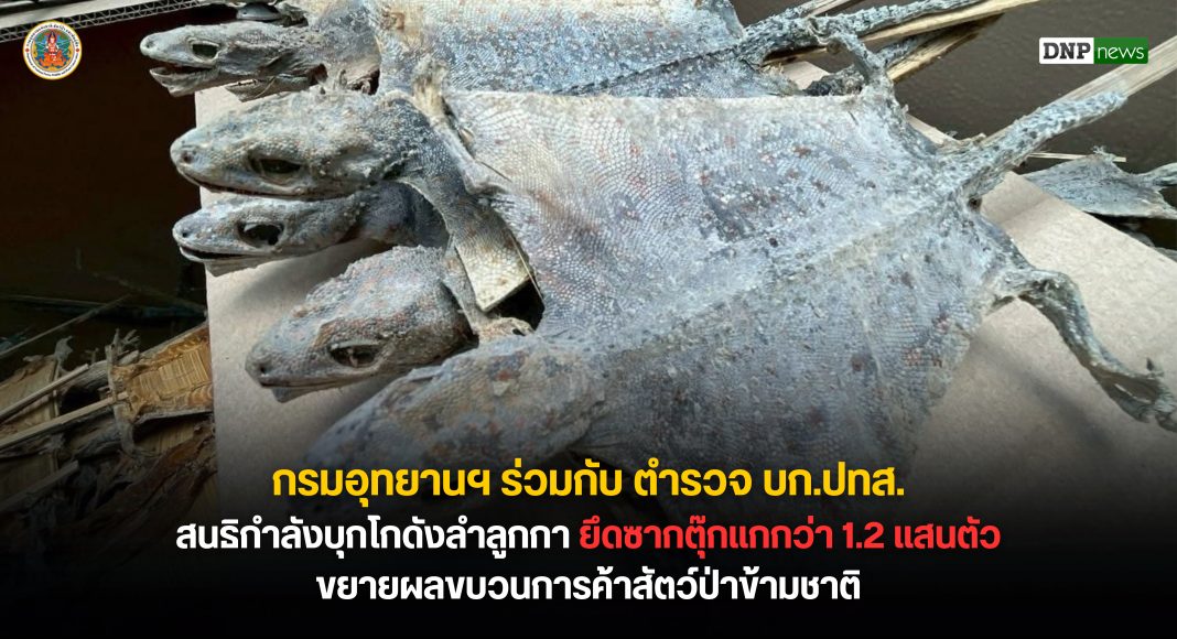 กรมอุทยานฯ ร่วมกับ ตำรวจ บก.ปทส. สนธิกำลังบุกโกดังลำลูกกา ยึดซากตุ๊กแกกว่า 1.2 แสนตัว ขยายผลขบวนการค้าสัตว์ป่าข้ามชาติ