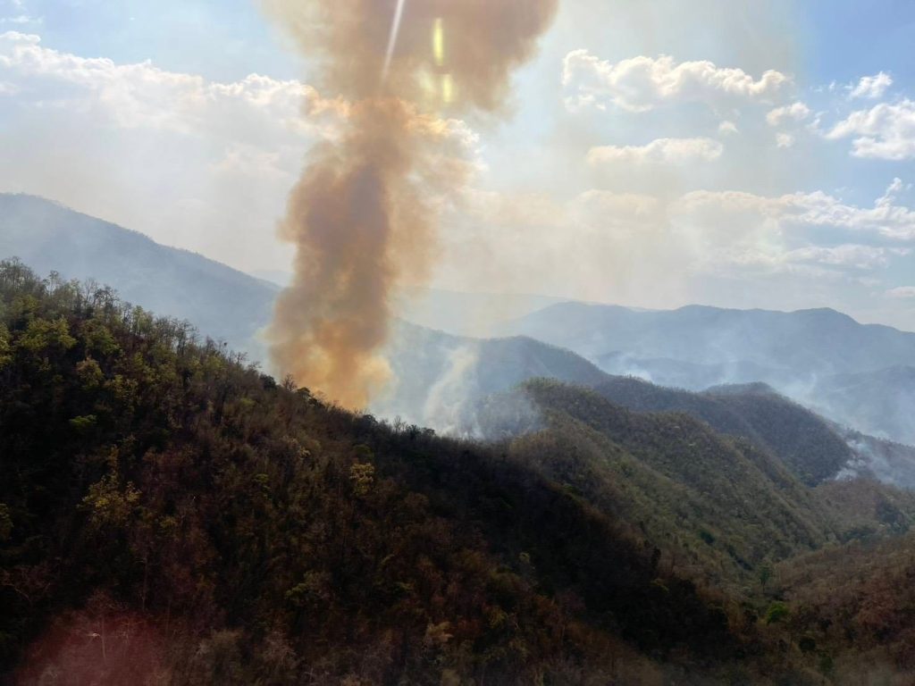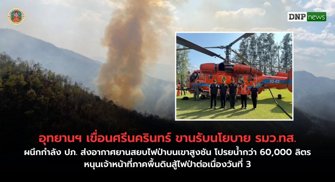 เพื่อให้ภารกิจสำเร็จตามเป้าหมายในการลดพื้นที่เผาไหม้ กรมป้องกันและบรรเทาสาธารณภัย (ปภ.) ได้ส่งเฮลิคอปเตอร์เข้าสนับสนุนตามแผนบูรณาการร่วมกัน โดยทำการตักน้ำจากเขื่อนศรีนครินทร์ขึ้นไปโปรยดับไฟในจุดวิกฤต รวมทั้งสิ้น 20 เที่ยวบิน ปริมาณน้ำกว่า 60,000 ลิตร ช่วยลดความรุนแรงของไฟป่าและสร้างความปลอดภัยให้กับเจ้าหน้าที่ภาคพื้นดินได้เป็นอย่างดี