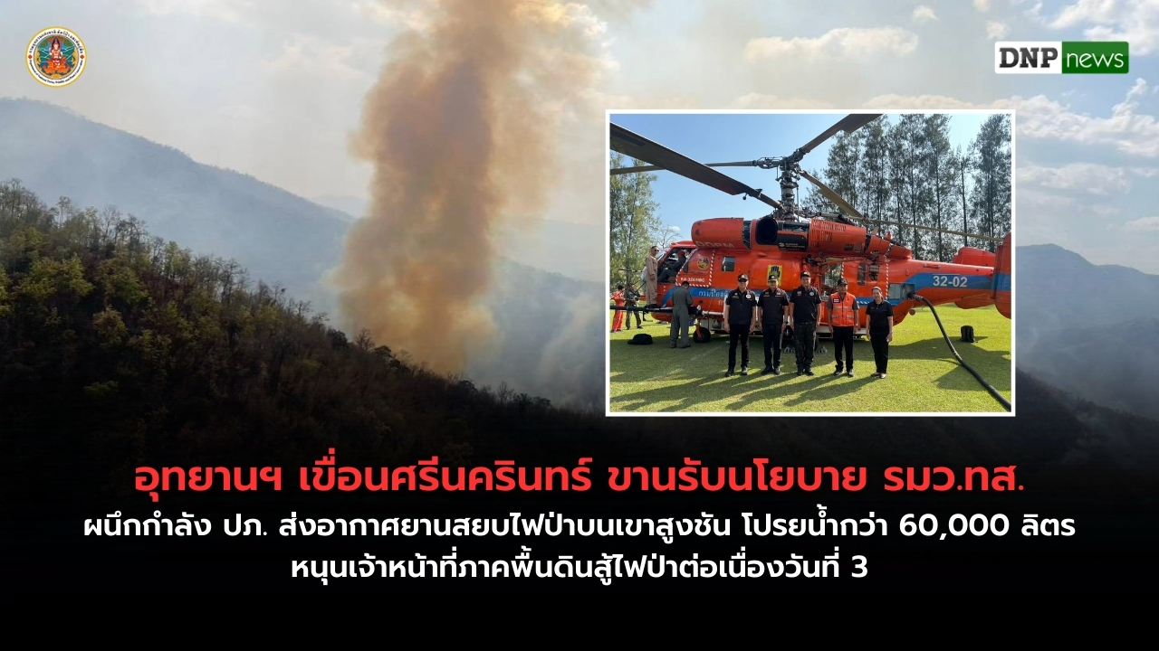 วันที่ 10 มีนาคม 2569 ศูนย์ปฏิบัติการไฟป่า (War Room) อุทยานแห่งชาติเขื่อนศรีนครินทร์ รายงานผลการปฏิบัติงานเชิงรุก ตามนโยบายเข้มข้นของรัฐมนตรีว่าการกระทรวงทรัพยากรธรรมชาติและสิ่งแวดล้อม ที่เน้นย้ำการเฝ้าระวังจุดความร้อน (Hotspot) และการเข้าถึงที่เกิดเหตุอย่างรวดเร็ว โดยล่าสุดได้รับความร่วมมือจากกรมป้องกันและบรรเทาสาธารณภัย (ปภ.) ส่งอากาศยานสนับสนุนภารกิจดับไฟป่าบริเวณ “เขาโกเต็ง” ท้องที่บ้านปลายนาสวน จังหวัดกาญจนบุรี
