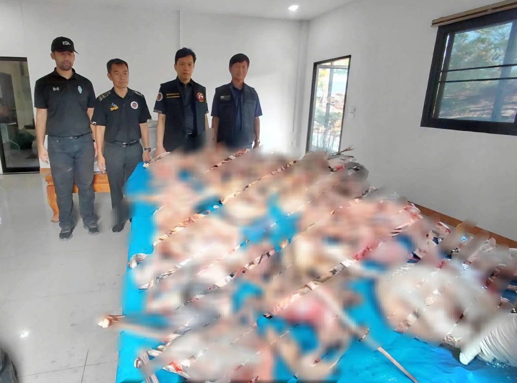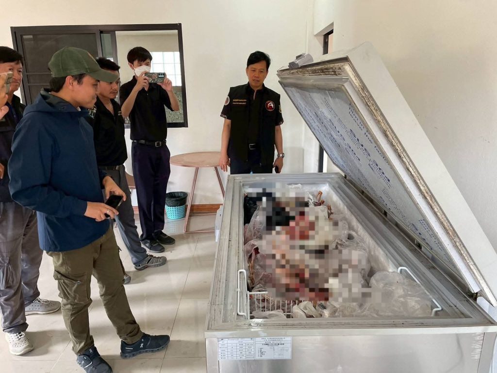 จากการตรวจค้นอาคารลักษณะโรงครัวภายในบริษัท เจ้าหน้าที่พบตู้แช่แข็งขนาด 612 ลิตร บรรจุซากสัตว์ป่าคุ้มครองจำนวนมาก โดยสามารถตรวจยึดได้ทั้งสิ้นดังนี้ กลุ่มนก 23 ชนิด รวม 85 ซาก ประกอบด้วย นกช้อนหอยดำเหลือบ นกเค้า นกกาน้ำเล็ก นกอ้ายงั่ว นกปากห่าง นกอีโก้ง นกยางโทนน้อย นกกาบบัว นกเอี้ยงด่าง นกแสก นกช้อนหอย นกอีล้ำ นกเป็ดน้ำ นกเป็ด นกคุ้ม นกเขาเปล้า นกยาง เหยี่ยว และนกไม่ทราบชนิดอีกหลายซาก นอกจากนี้ ยังมีกลุ่มสัตว์เลี้ยงลูกด้วยนม 8 ชนิด ได้แก่ กระรอก ลิ่น และอีเห็น รวมถึงซากส่วนต่างๆ 4 ชิ้น และเกล็ดลิ่นไม่ทราบชนิด น้ำหนักรวม 900 กรัม ซึ่งเป็นสัตว์ป่าที่ถูกลักลอบค้ามากที่สุดชนิดหนึ่งของโลก