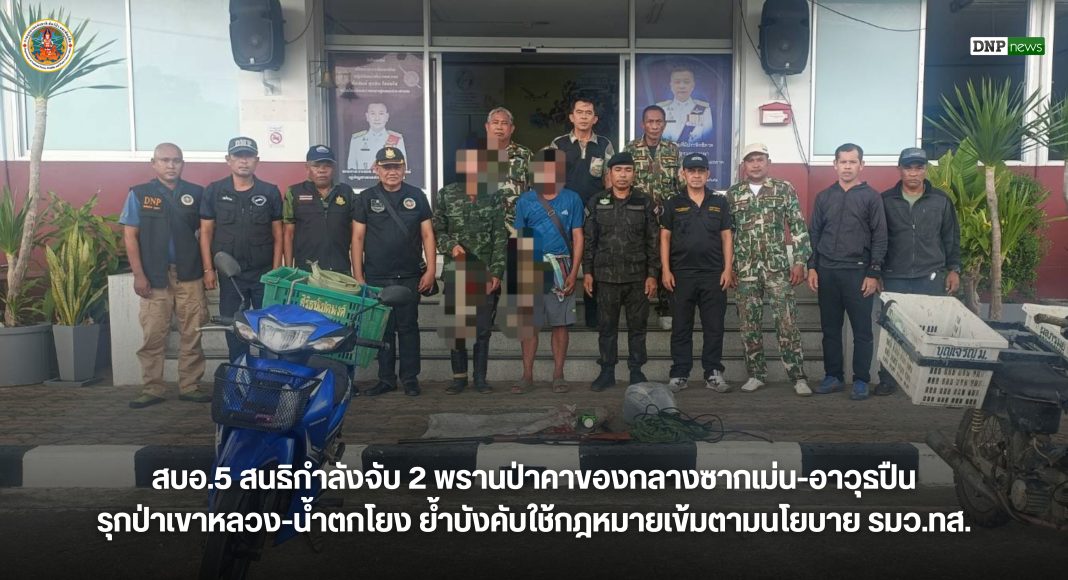 สบอ.5 สนธิกำลังจับ 2 พรานป่าคาของกลางซากเม่น-อาวุธปืน รุกป่าเขาหลวง-น้ำตกโยง ย้ำบังคับใช้กฎหมายเข้มตามนโยบาย รมว.ทส.