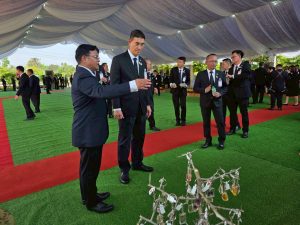 จากนั้น พระบาทสมเด็จพระเจ้าอยู่หัว และสมเด็จพระนางเจ้า ฯ พระบรมราชินี ทรงปลูกต้นรวงผึ้ง จำนวน 1 ต้น พร้อมทั้งนายทองลุน สีสุลิด ประธานประเทศ และนางนาลี สีสุลิด ภริยา ร่วมปลูกต้นกันเกรา ณ หน้าอาคารสัญลักษณ์ 30 ปี เพื่อเป็นที่ระลึกถึงความสัมพันธ์อันแน่นแฟ้นระหว่างสองประเทศ ก่อนเสด็จพระราชดำเนินไปทอดพระเนตรแปลงเกษตรทฤษฎีใหม่ ซึ่งอยู่ในพื้นที่ศูนย์พัฒนาฯ ก่อนเสด็จพระราชดำเนินกลับโรงแรมที่ประทับ.