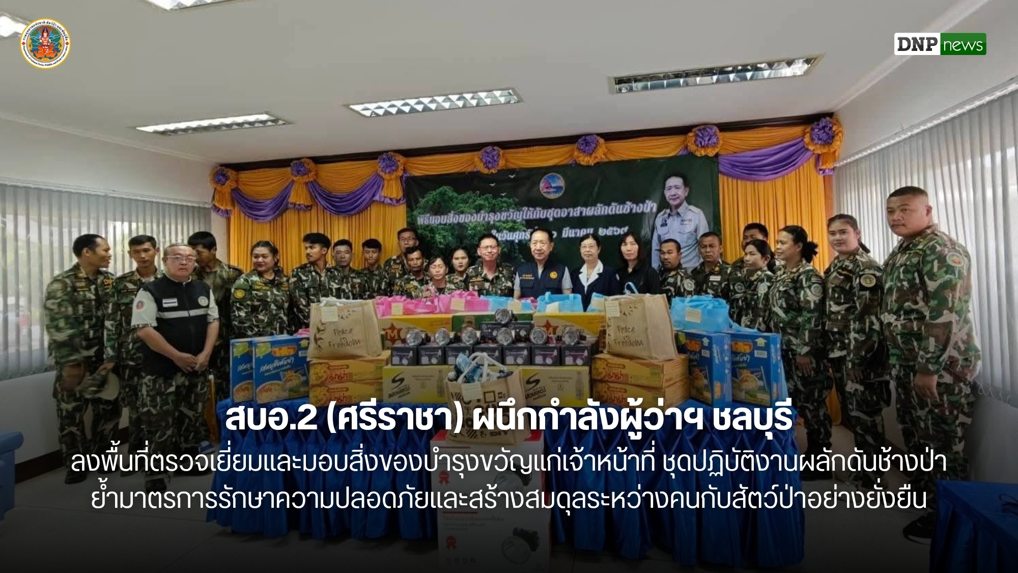 นายสราวุธ ระบุว่า เพื่อเป็นการสนับสนุนการปฏิบัติงานและสร้างขวัญกำลังใจแก่บุคลากรแนวหน้า นายนริศ นิรามัยวงศ์ ผู้ว่าราชการจังหวัดชลบุรี พร้อมด้วยคณะผู้บริหารจากสำนักบริหารพื้นที่อนุรักษ์ที่ 2 (ศรีราชา) ได้เดินทางลงพื้นที่ ณ ที่ทำการองค์การบริหารส่วนตำบลคลองพลู อำเภอหนองใหญ่ จังหวัดชลบุรี เพื่อตรวจเยี่ยมการปฏิบัติงานและมอบสิ่งของบำรุงขวัญให้แก่เจ้าหน้าที่ผู้ปฏิบัติงานด้วยความเสียสละ