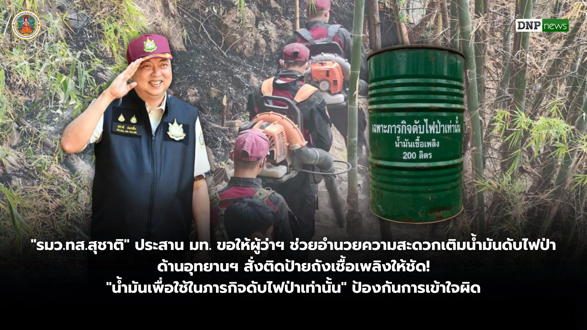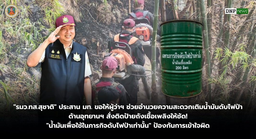 เมื่อวันที่ 20 มีนาคม 2569 นายอรรถพล เจริญชันษา อธิบดีกรมอุทยานแห่งชาติ สัตว์ป่า และพันธุ์พืช เปิดเผยว่า ตามข้อสั่งการของนายสุชาติ ชมกลิ่น รองนายกรัฐมนตรีและรัฐมนตรีว่าการกระทรวงทรัพยากรธรรมชาติและสิ่งแวดล้อม (ทส.) ที่มีความห่วงใยต่อสถานการณ์ไฟป่าในขณะนี้ โดยท่านรองนายกฯ และ รมว.ทส. ได้ประสานไปยังปลัดกระทรวงมหาดไทย เพื่อขอความร่วมมือแจ้งไปยังผู้ว่าราชการจังหวัดทั่วประเทศ สำหรับการจัดซื้อหรือเติมน้ำมันเชื้อเพลิงใส่ถังสำรองสำหรับภารกิจดับไฟป่า เนื่องจากการเคลื่อนย้ายน้ำมันเชื้อเพลิงใส่ถังสำรองมีความจำเป็นอย่างยิ่งในการสนับสนุนภารกิจดับไฟป่า ซึ่งต้องปฏิบัติงานในพื้นที่ทุรกันดารและห่างไกลจากสถานีบริการน้ำมัน