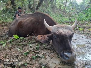 เมื่อไปถึงจุดเกิดเหตุ พบกระทิงป่าเพศผู้ขนาดใหญ่จมอยู่ในหล่มโคลนที่มีความหนืดสูงเกือบครึ่งลำตัว สภาพเริ่มมีอาการอ่อนแรงจากการพยายามดิ้นรนขึ้นจากโคลนดูด เจ้าหน้าที่จึงได้เร่งวางแผนให้ความช่วยเหลืออย่างรัดกุม โดยการขุดเปิดหน้าดินเพื่อลดแรงดูดของโคลนและใช้เครื่องมือสนับสนุนในการช่วยพยุงตัวสัตว์ จนกระทั่งสามารถช่วยเหลือกระทิงตัวดังกล่าวขึ้นสู่พื้นดินที่แข็งมั่นคงได้สำเร็จเป็นที่เรียบร้อย