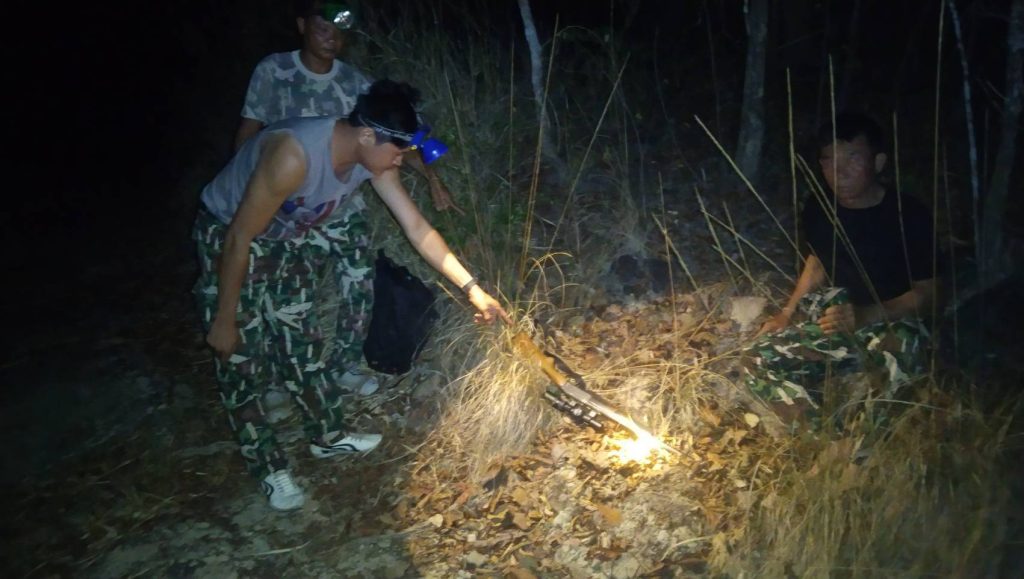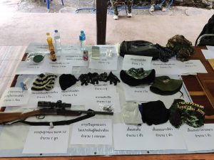 จากการตรวจสอบที่เกิดเหตุ เจ้าหน้าที่สามารถตรวจยึดของกลางรวม 21 รายการ ประกอบด้วย อาวุธปืนลูกซองยาวเดี่ยวติดลำกล้อง 1 กระบอก พร้อมกระสุนขนาด 12 ในรังเพลิง 1 นัด รถจักรยานยนต์ 1 คัน (ไม่ติดแผ่นป้ายทะเบียน) เปลนอน เสื้อลายทหาร หมวกไอ้โม่ง อุปกรณ์ส่องสว่าง และเสบียงอาหาร