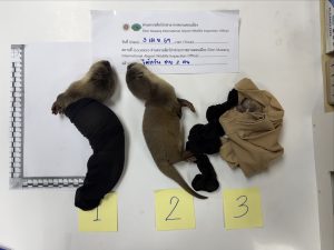 จากการตรวจสอบพบสัตว์ป่ามีชีวิตซุกซ่อนบริเวณร่างกาย รวมจำนวน 3 ตัว ได้แก่ 1. นากเล็กเล็บสั้น จำนวน 2 ตัว 2. นางอาย จำนวน 1 ตัว จึงได้นำส่ง กองกำกับการ 1 บก.ปทส. และแจ้งข้อกล่าวหาร่วมกันกระทำความผิดตามพระราชบัญญัติสงวนและคุ้มครองสัตว์ป่า พ.ศ. 2562 มาตรา 17 ฐานครอบครองสัตว์ป่าคุ้มครองโดยไม่ได้รับอนุญาต มาตรา 23 ฐานพยายามส่งออกสัตว์ป่าคุ้มครองโดยไม่ได้รับอนุญาตจากอธิบดี และพระราชบัญญัติศุลกากร พ.ศ. 2560