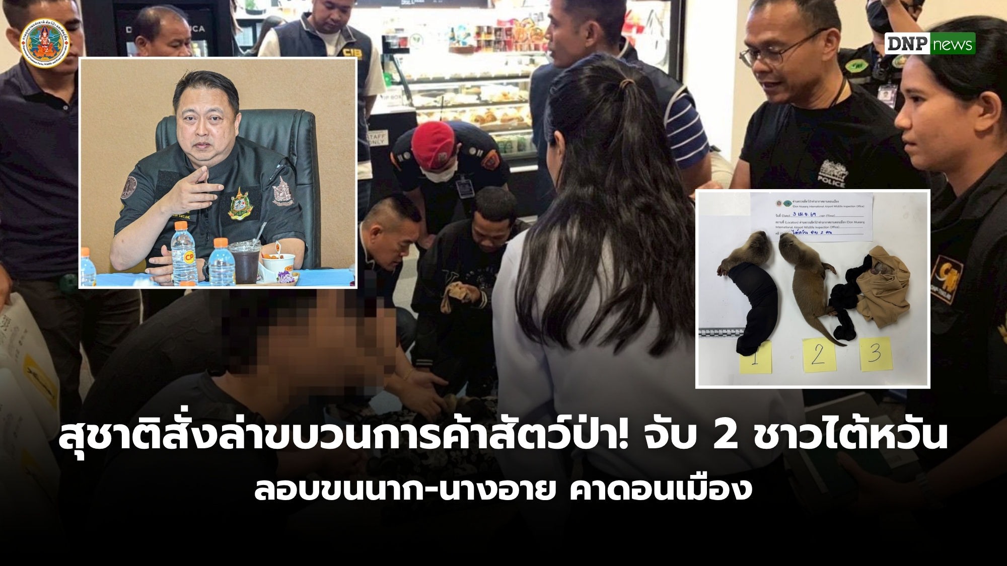 วันที่ 3 เมษายน 2569 นางสาวกนกวรรณ แก้วปกาศิต หัวหน้าด่านตรวจสัตว์ป่าท่าอากาศยานดอนเมือง รายงานว่า เมื่อเวลา 03.45 น. เจ้าหน้าที่ด่านตรวจสัตว์ป่าท่าอากาศยานดอนเมือง ได้ร่วมกับกองบังคับการปราบปรามการกระทำความผิดเกี่ยวกับทรัพยากรธรรมชาติและสิ่งแวดล้อม (บก.ปทส.) เจ้าหน้าที่การท่าอากาศยานดอนเมือง และสายการบินไลออนแอร์ จับกุมผู้กระทำผิดลักลอบขนย้ายสัตว์ป่าออกนอกประเทศเป็นชายชาวไต้หวัน 2 คน อายุ 32 ปี และ 25 ปี ณ ท่าอากาศยานดอนเมือง ขณะพยายามลักลอบนำสัตว์ป่าออกนอกประเทศ ด้วยเที่ยวบิน SL392 ไปยังปลายทางสาธารณรัฐจีน (ไต้หวัน) ที่สนามบินเกาสง
