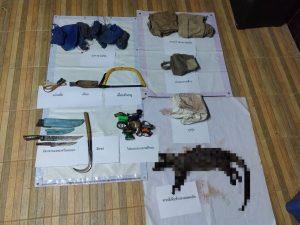 ​จากการปฏิบัติงาน เจ้าหน้าที่ได้เข้าตรวจสอบหลังได้ยินเสียงสุนัขมีพฤติกรรมไล่ล่าสัตว์ จนพบตัวผู้ต้องหา 2 ราย คือ นายประชาญ และนายแหวง​ ราษฎรชาว จ.กาฬสินธุ์ ตรวจสอบพบของกลางประกอบด้วย​ ซากอีเห็นข้างลาย (เพศเมีย) 1 ซาก​ พร้อมอุปกรณ์การกระทำผิด​ เลื่อยคันธนู, มีดขอ, มีดปลายแหลม, เสียม, หนังสติ๊ก และไฟฉายคาดศีรษะ