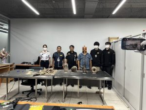 คณะเจ้าหน้าที่พบของกลางได้แก่ นอแรดจำนวน 5 ชิ้น (แบ่งเป็น 4 ท่อน) น้ำหนักรวมสิ่งห่อหุ้ม 12.77 กิโลกรัม ผู้ต้องหาใช้วิธีการนำนอแรดห่อหุ้มด้วยเปลือกไม้และหล่อทับด้วยวัสดุคล้ายเรซิ่นเพื่อตบตาเจ้าหน้าที่ ซุกซ่อนมาในกระเป๋าเดินทางทรงแข็งจำนวน 2 ใบ