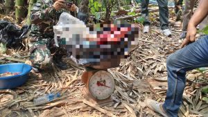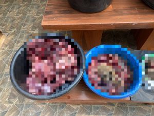 เมื่อเจ้าหน้าที่ไปถึงพบบุคคลเพศหญิงทราบชื่อคือ นางจันทร์เพ็ญ (สงวนนามสกุล) อายุ 50 ปี ภูมิลำเนาชาวอำเภอทองผาภูมิ กำลังนั่งชำแหละซากสัตว์ป่าอยู่บนผ้ายางสีดำ ตรวจสอบพบเป็นซากกวางป่าสดใหม่ที่ถูกหั่นแยกเป็นกอง พร้อมอุปกรณ์มีดอีโต้และเขียง รวมน้ำหนักซากกวางป่าสูงถึง 106 กิโลกรัม