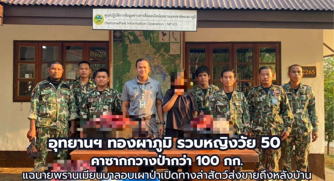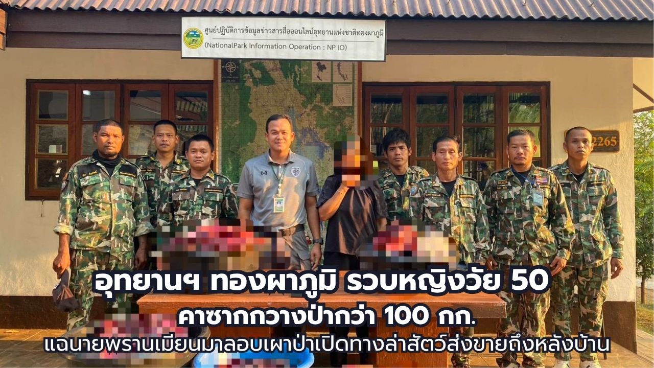 เมื่อวันที่ 6 เมษายน 2569 นายยุทธพงค์ ดำศรีสุข หัวหน้าอุทยานแห่งชาติทองผาภูมิ นำกำลังเจ้าหน้าที่ชุดพิทักษ์ป่าสนธิกำลังร่วมกับ ตชด.135, ทหารหน่วยเฉพาะกิจลาดหญ้า และตำรวจ สภ.ทองผาภูมิ เข้าจับกุมหญิงไทยขณะกำลังชำแหละซากกวางป่าสดใหม่น้ำหนักรวม 106 กิโลกรัม บริเวณหลังร้านค้าในตำบลห้วยเขย่ง พบเป็นผลพวงจากการลักลอบจุดไฟเผาป่าเพื่อไล่ล่าสัตว์
