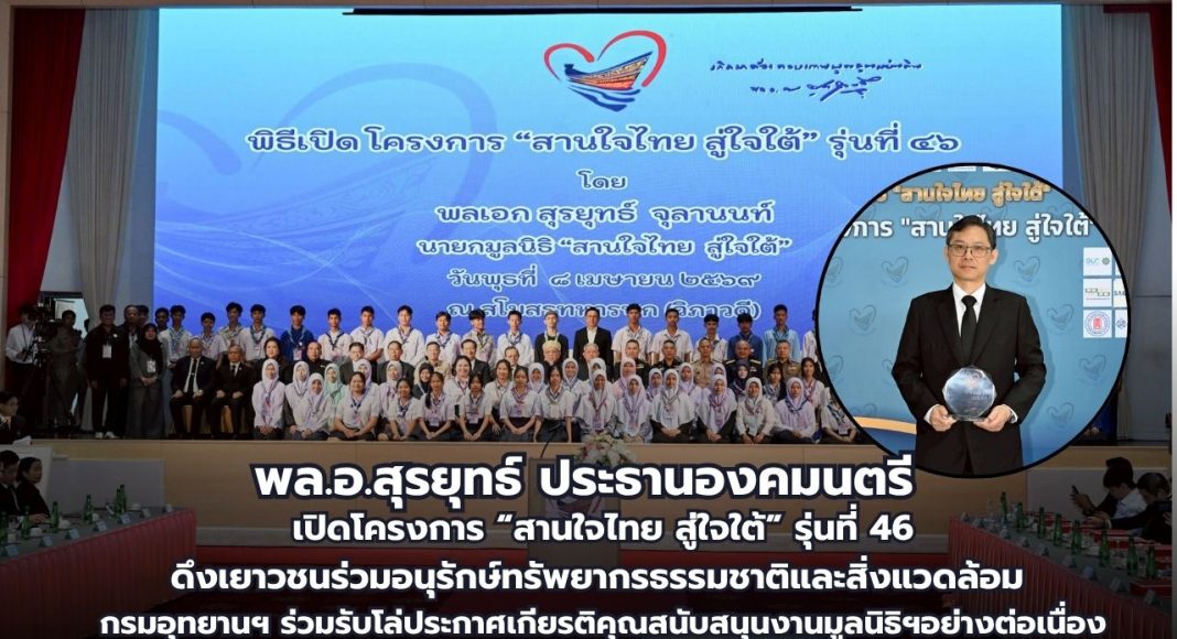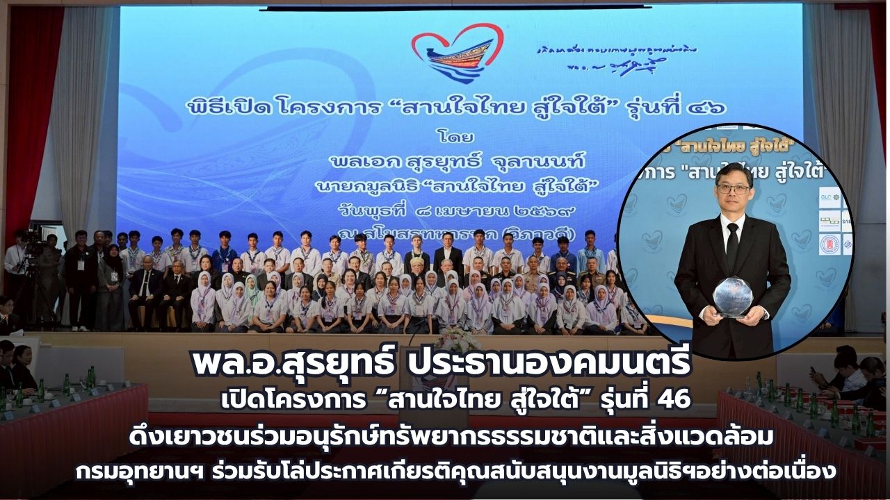 พล.อ.สุรยุทธ์ ประธานองคมนตรี เปิดโครงการ “สานใจไทย สู่ใจใต้” รุ่นที่ 46 ดึงเยาวชนร่วมอนุรักษ์ทรัพยากรธรรมชาติและสิ่งแวดล้อม กรมอุทยานฯ ร่วมรับโล่ประกาศเกียรติคุณสนับสนุนงานมูลนิธิฯอย่างต่อเนื่อง