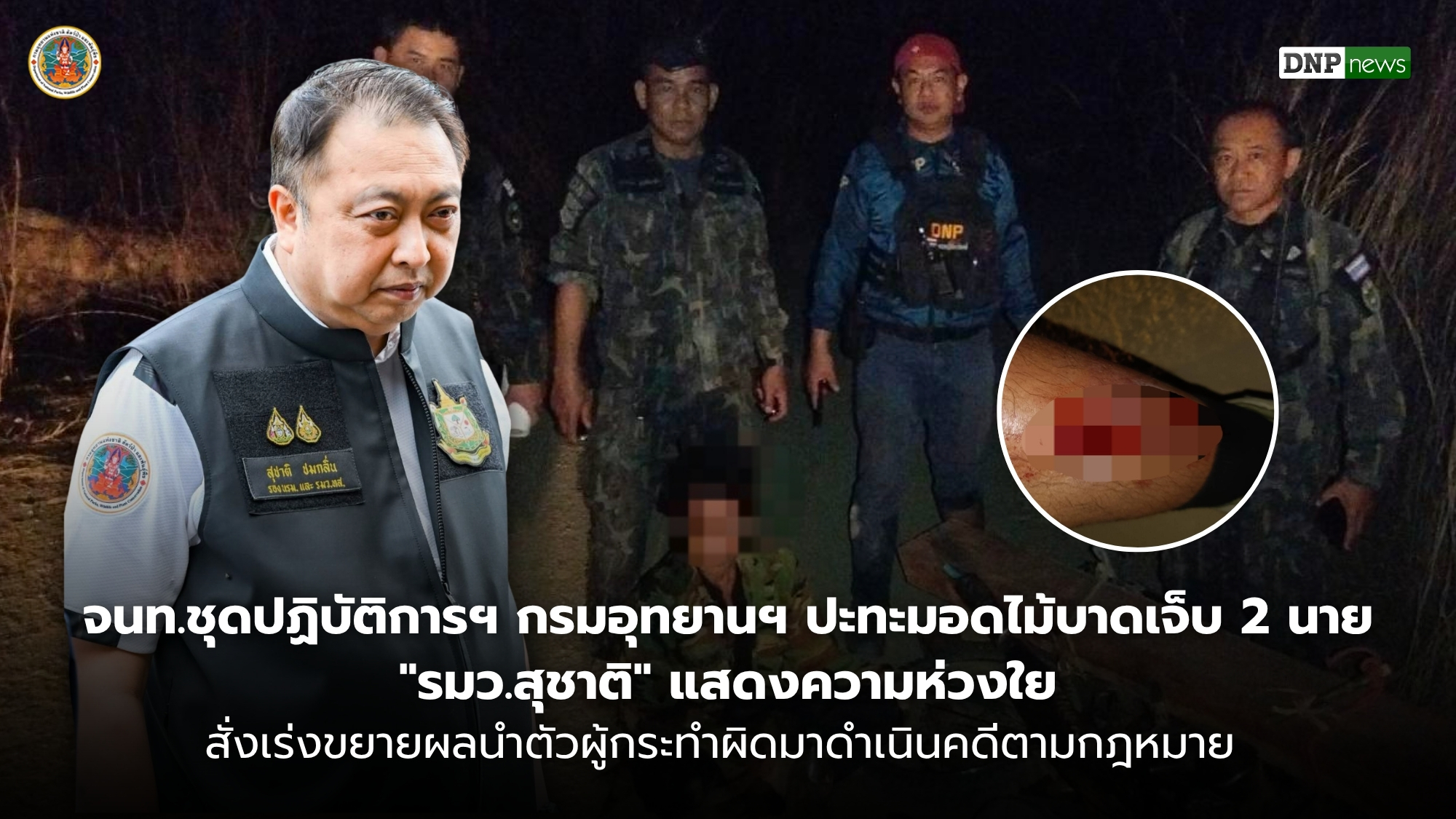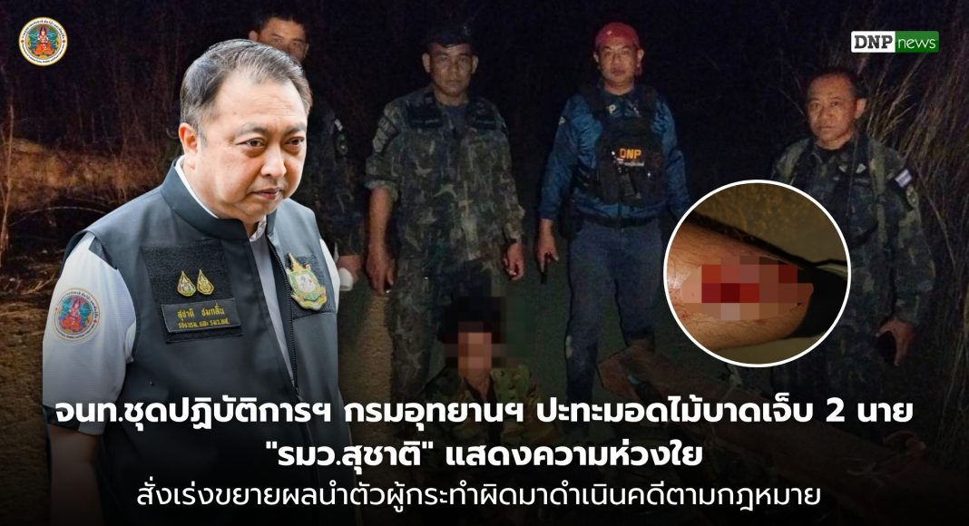 อธิบดีกรมอุทยานฯ กล่าวเพิ่มเติมว่า “ท่านรัฐมนตรีสุชาติ ชมกลิ่น ได้ฝากความห่วงใยมายังเจ้าหน้าที่ผู้ปฏิบัติงานทั้ง 2 นาย ขอให้ปลอดภัยและหายจากอาการบาดเจ็บโดยเร็ว และยังได้สั่งการให้ดูแลเรื่องสวัสดิการและการรักษาพยาบาลอย่างเต็มที่ พร้อมทั้งชื่นชมในความกล้าหาญที่ปฏิบัติหน้าที่ปกป้องทรัพยากรธรรมชาติอย่างเข้มแข็ง และได้สั่งการให้ประสานข้อมูลกับตำรวจ สภ.ปง เพื่อเร่งขยายผลติดตามตัวผู้ต้องหาที่หลบหนีมาดำเนินคดีตามกฎหมายให้ถึงที่สุด โดยย้ำว่าจะไม่มีการผ่อนปรนให้กับผู้ที่ทำร้ายเจ้าหน้าที่และทำลายทรัพยากรธรรมชาติอย่างเด็ดขาด”