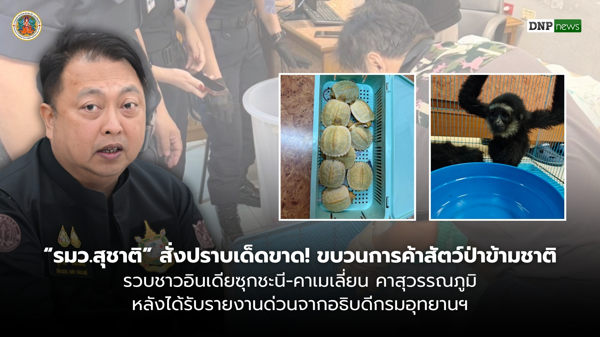 วันที่ 14 เมษายน 2569 นายสุชาติ ชมกลิ่น รัฐมนตรีว่าการกระทรวงทรัพยากรธรรมชาติและสิ่งแวดล้อม (รมว.ทส.) เปิดเผยว่าได้รับรายงานด่วนจากนายอรรถพล เจริญชันษา อธิบดีกรมอุทยานแห่งชาติ สัตว์ป่า และพันธุ์พืช เกี่ยวกับการสนธิกำลังเข้าจับกุมขบวนการลักลอบค้าสัตว์ป่าระหว่างประเทศรายใหญ่ ณ ท่าอากาศยานสุวรรณภูมิ ซึ่งเป็นการปฏิบัติงานเชิงรุกตามนโยบายคุมเข้มการกระทำผิดด้านทรัพยากรธรรมชาติ