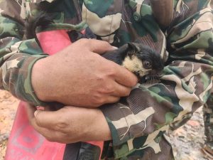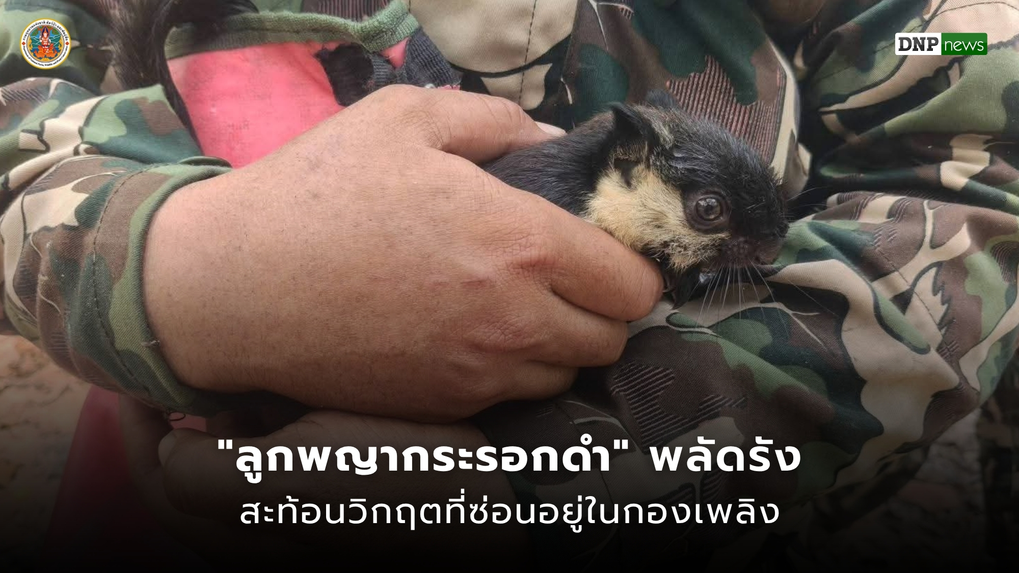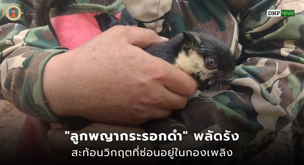 ท่ามกลางควันไฟและเถ้าถ่านที่ยังคงคุกรุ่น เจ้าหน้าที่พิทักษ์ป่าในพื้นที่เขตห้ามล่าสัตว์ป่าห้วยทับเสลา-ห้วยระบำ สำนักบริหารพื้นที่อนุรักษ์ที่ 12 (นครสวรรค์) ได้พบลูกพญากระรอกดำตัวน้อยอยู่ใต้ต้นไม้ระหว่างปฏิบัติภารกิจทำแนวกันไฟ เชื่อว่าตกหล่นออกจากโพรงรัง อันเป็นผลสืบเนื่องจากวิกฤตไฟป่าที่กำลังลุกลาม โชคดีที่ได้รับการช่วยเหลือและดูแลได้ทันเวลาก่อนที่ชีวิตน้อยๆ จะสูญสิ้น