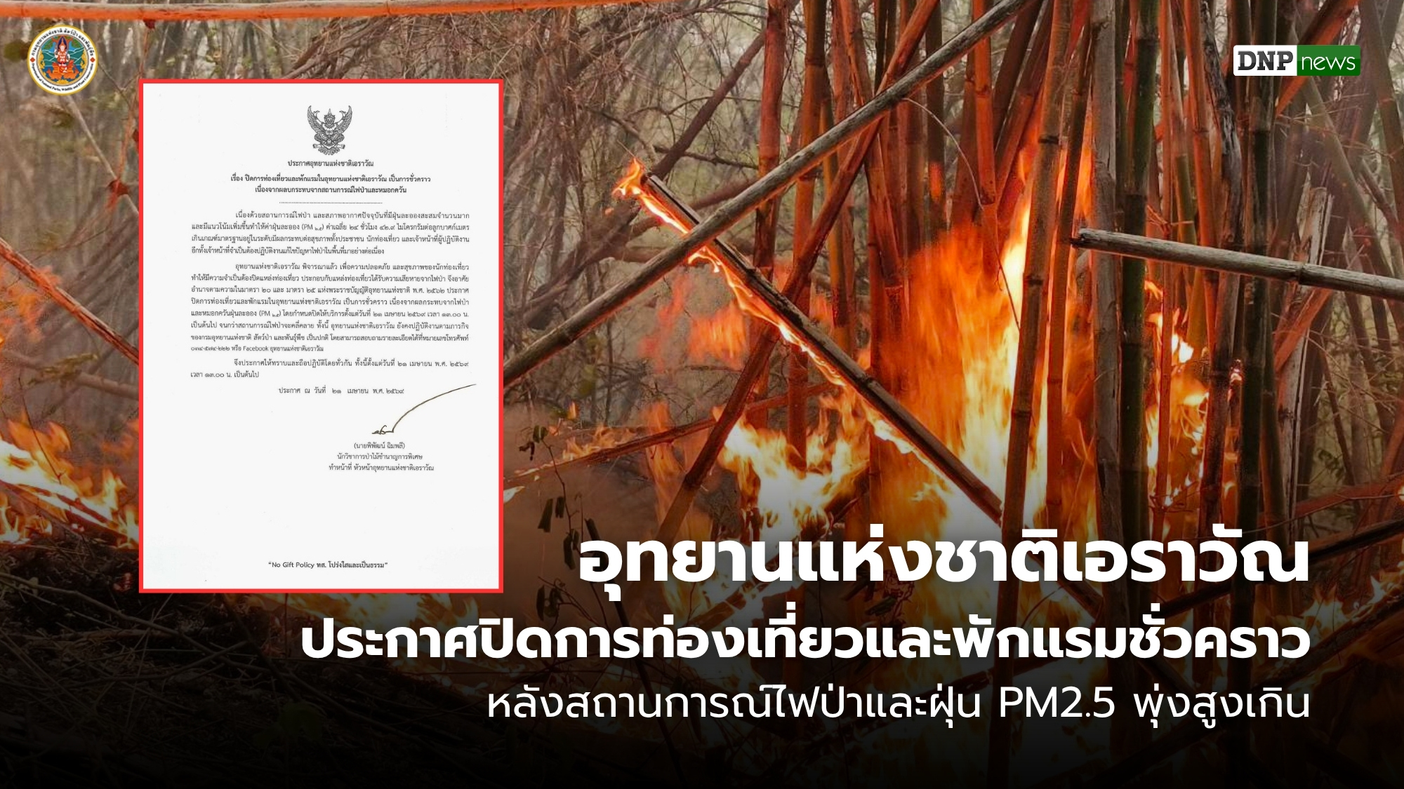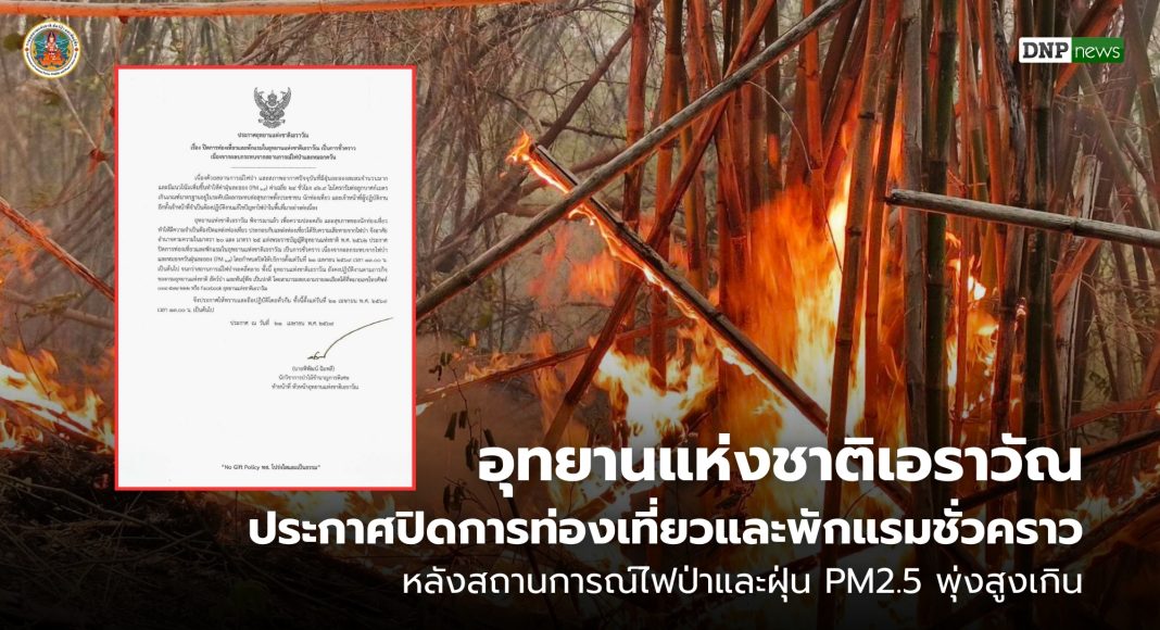 อุทยานแห่งชาติเอราวัณ ประกาศปิดการท่องเที่ยวและพักแรมชั่วคราว หลังสถานการณ์ไฟป่าและฝุ่น PM2.5 พุ่งสูงเกินมาตรฐาน เพื่อความปลอดภัยของนักท่องเที่ยว