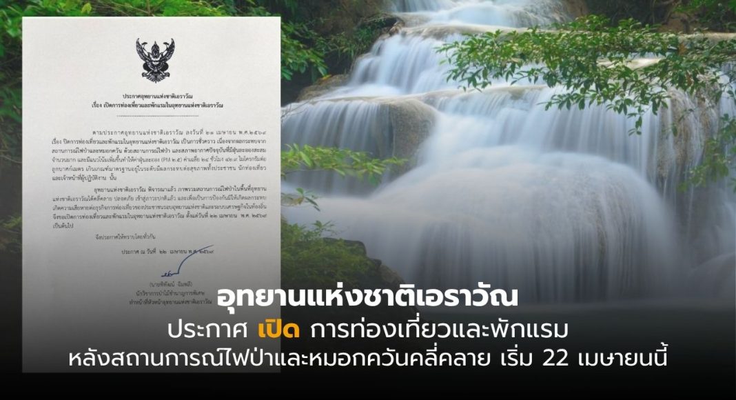 อุทยานแห่งชาติเอราวัณ ประกาศเปิดการท่องเที่ยวและพักแรม หลังสถานการณ์ไฟป่าและหมอกควันคลี่คลาย เริ่ม 22 เมษายนนี้