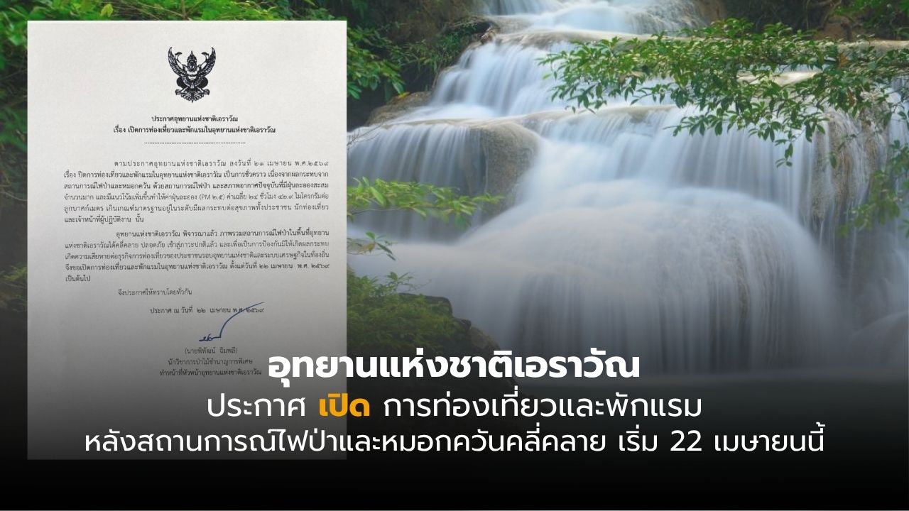 อุทยานแห่งชาติเอราวัณ ประกาศเปิดการท่องเที่ยวและพักแรมในเขตอุทยานแห่งชาติอย่างเป็นทางการ ตั้งแต่วันที่ 22 เมษายน 2569 เป็นต้นไป หลังสถานการณ์ไฟป่าในพื้นที่คลี่คลายและคุณภาพอากาศกลับเข้าสู่ภาวะปกติ เพื่อกระตุ้นเศรษฐกิจและการท่องเที่ยวในท้องถิ่น