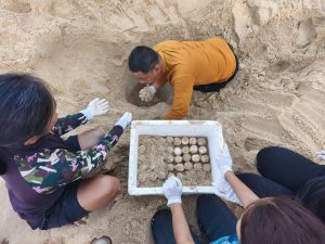 อย่างไรก็ตาม เนื่องด้วยตำแหน่งหลุมไข่อยู่ในจุดที่สุ่มเสี่ยงต่อการถูกน้ำทะเลท่วมถึงตามอิทธิพลของน้ำขึ้น-น้ำลง และอาจได้รับอันตรายจากปัจจัยทางธรรมชาติ คณะเจ้าหน้าที่จึงได้ร่วมกันเคลื่อนย้ายไข่เต่าทั้งหมดไปเพาะฟักยังพื้นที่ปลอดภัย บริเวณชายหาดหน้าศูนย์บริการนักท่องเที่ยว โดยมีการจัดตั้งคอกกั้นและติดตั้งระบบรักษาความปลอดภัย พร้อมจัดเจ้าหน้าที่เฝ้าระวังตลอด 24 ชั่วโมง
